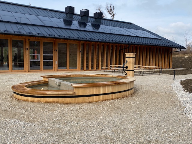 Bevor man sich auf den Rundgang begibt, fällt der Blick auf einen runden Holzbrunnen mit fließendem Wasser. Er ist in traditioneller Fassbauweise gefertigt und erinnert damit an jene Holzfässer, die früher unter den Dachrinnen der Bauernhäuser standen und Regenwasser sammelten. Ein Brunnen mit Geschichte – und ein Ort zum Rasten, Erfrischen und für Kinder zum Planschen. Das klare Wasser stammt direkt vom Untersberg.