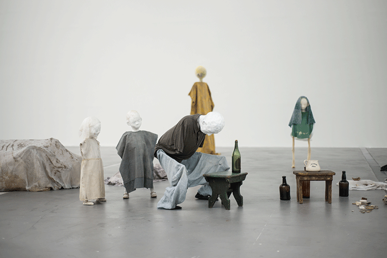 Auf der linken Seite der Ausstellungshalle stellt die Künstlerin aus dem täglichen Alltag ein Szenario mit Skulpturen/Figuren dar. Diese Figuren sind so installiert, dass man sich ein Bild aus dem Alltagsleben vorstellt. Rund um diese Figuren befinden sich Stoffe, Handtücher, Schalen, Teller, Tonscherben, Kekse und Flaschen ebenfalls aus dem alltäglichen Leben. Die Figuren (als Erwachsene und als Kinder dargestellt und inszeniert) sind in zerfetzten bedruckten Stoffen gekleidet, die Kopfform aus Filz und bemalt. Angeordnet in verschiedenen Posen: stehend, schlafend oder sitzend. Eine Figur sitzt vor leeren oder vollen Flaschen? Dahinter zwei Figuren als Kinder, die sich die Frage stellen; warum trinkt er schon wieder? Der Blick in die Figurengruppe wirkt nicht abschreckend, dafür sorgt auch der von Licht durchflutete Raum, aber man beginnt nachzudenken. Welche Geschichte will uns die Künstlerin erzählen? Alltagsgeschichten? Armut oder andere Dramen? Geht es hier um Gegenwart oder Vergangenheit?