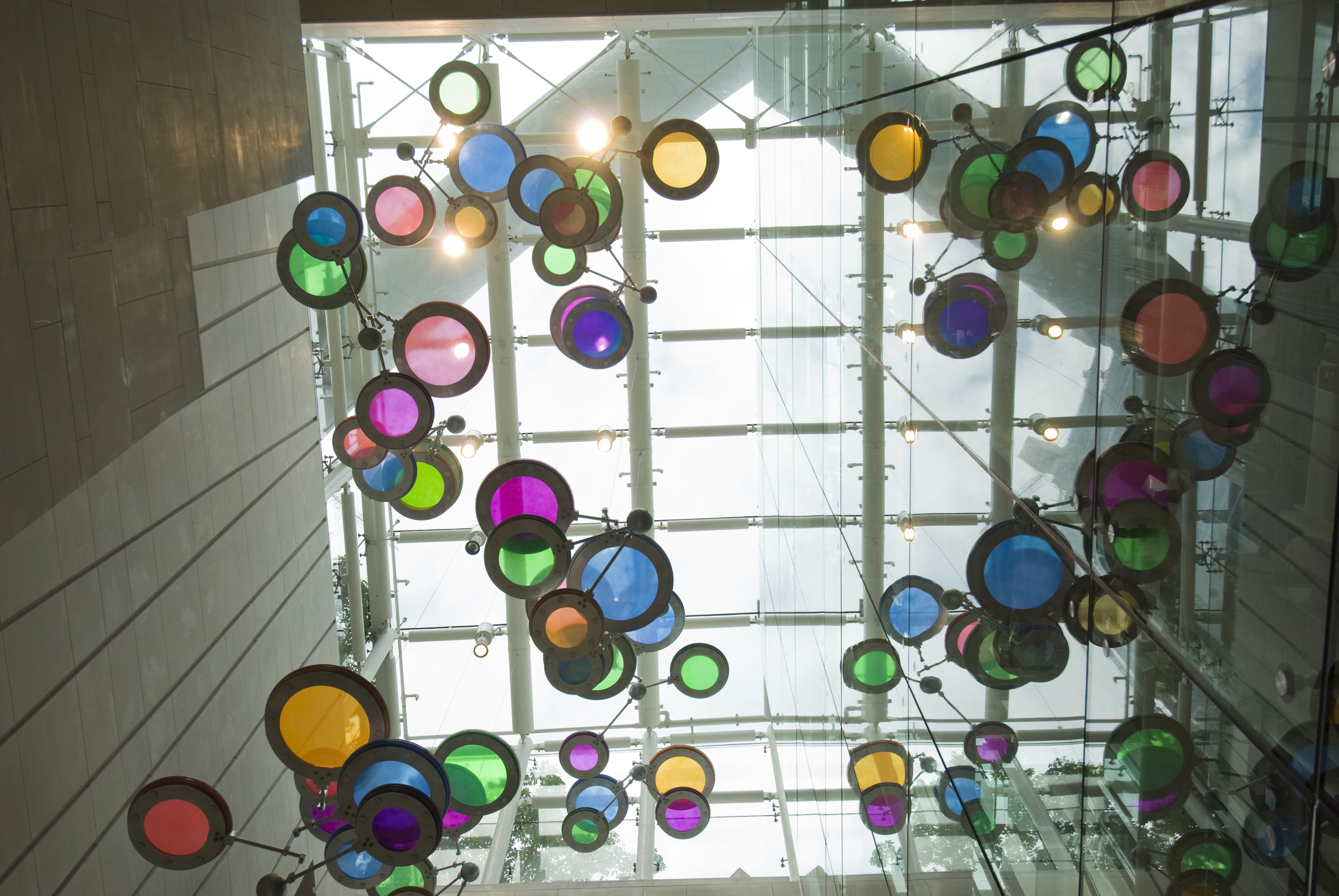 Ralfonso: Hier handelt es sich um transparente aber farbige Ringe, die sich über mehrere Etagen In- und Umeinander drehen. So gibt es immer andere visuelle und auch Farbkombinationen, die sich auch als weiche, farbige Schatten auf dem Boden wiederspiegeln. Die gleiche Mobile hängt auch in der neuen Lobby des „CHILDEN’S HOSPITAL“ in Pittsburg USA. Die Grundidee war Farbe, Licht (und farbige Schatten) und ruhige Bewegung in diese sehr hektischen, sehr großen Lobbies zu bringen. So wie auch ein Aquarium mit seinen bunten, langsam schwimmenden Fischen etwas sehr beruhigendes hat, so wollte ich einen Farb- und Tempo Gegensatz schaffen, der beruhigend und positiv wirkt. Dies war mir vor allem in dem riesigen Kinder Krankenhaus wichtig, für die Kinder, aber auch für die Eltern und Besucher.