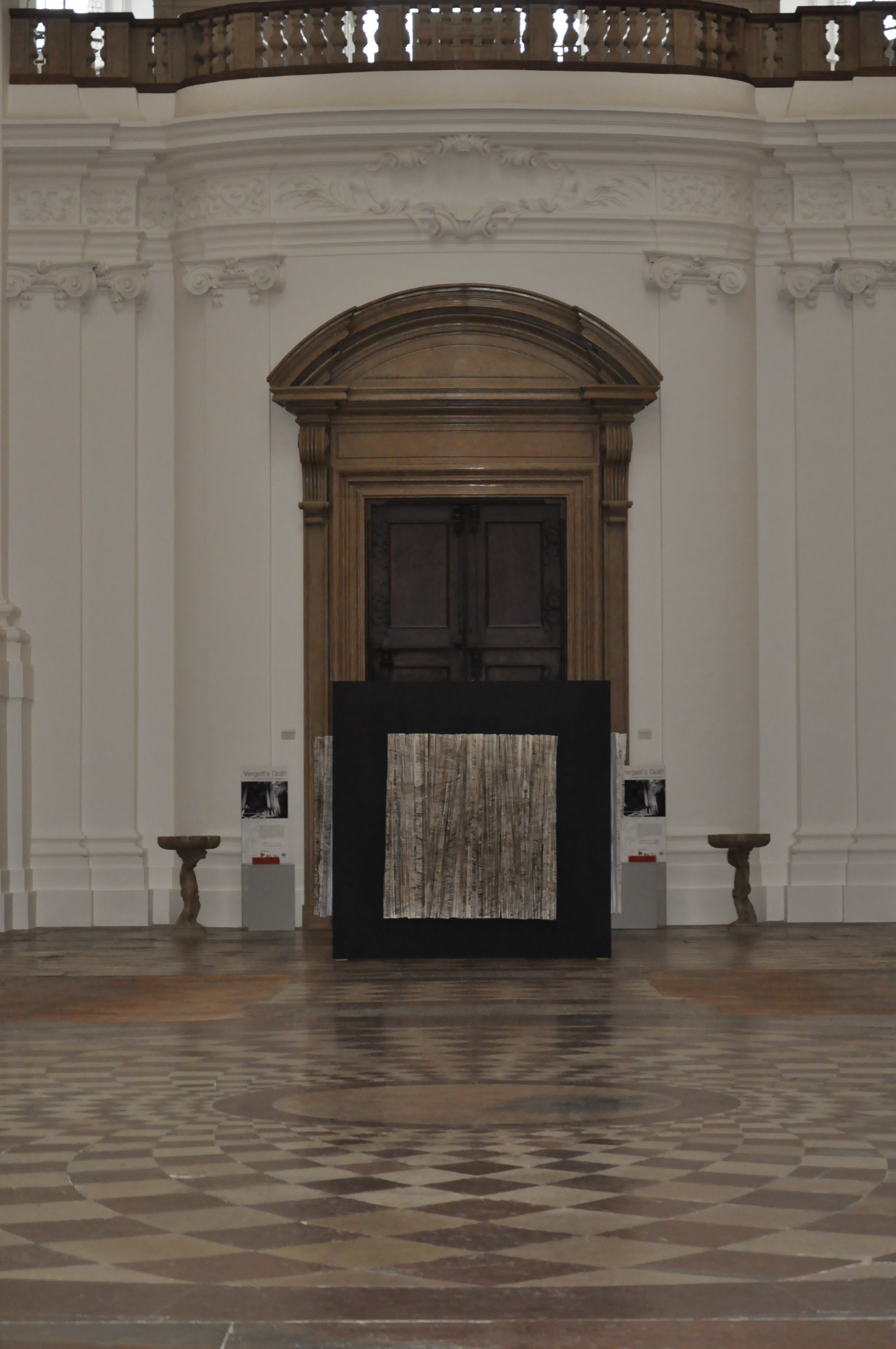 Ich besuchte die Kollegienkirche an einem frühen Vormittag, um mich mit dem Kunstwerk von Barbara Ullmann in Ruhe auseinanderzusetzen. Öffnet man die Kirchentüre, steht man plötzlich vor einem Kubus in Schwarz. An der vorderen Front hängt eine Art skulpturale Grafik.