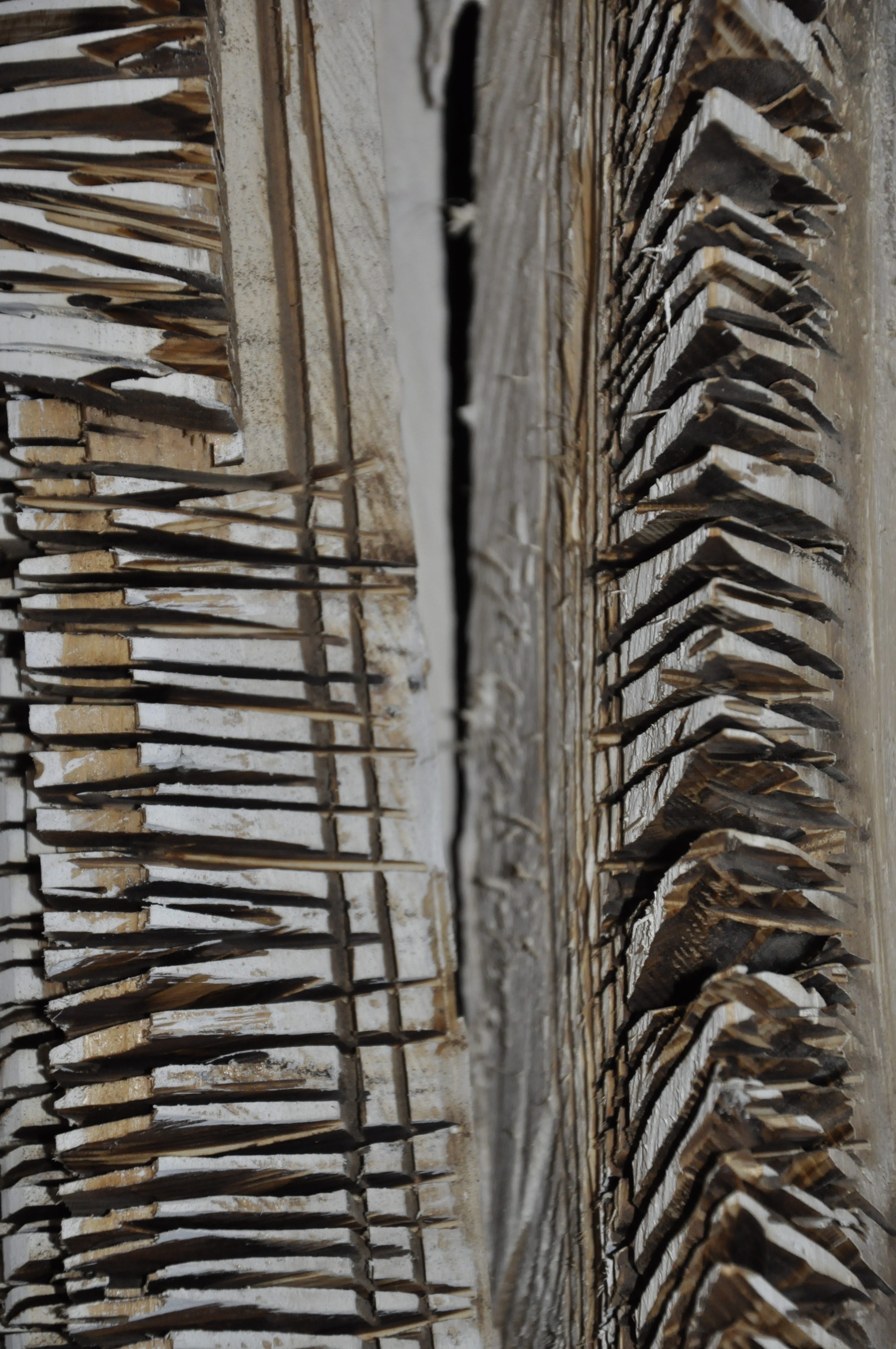 Nach kurzer Zeit hatte ich das Gefühl, es könnte sich auch um Fenster handeln, die die 4 Himmelsrichtungen symbolisieren. Man verspürt verschiedene Auslegungsarten um was es sich handeln könnte. Bei näherer Betrachtung der skulpturalen Grafik sieht man jedoch, dass es sich um massive Holzstücke, die mit der Flex so bearbeitet wurden, aus dessen Fläche dreidimensionale Gebilde voller grober Furchen entstanden, handelt. Je nach Lichtspiel und Blickwinkel findet eine stete Veränderung statt, welches wiederum ein grafisches Muster zum Vorschein bringt und man das Gefühl hat, es ist der Beginn einer Reise in das Innere.