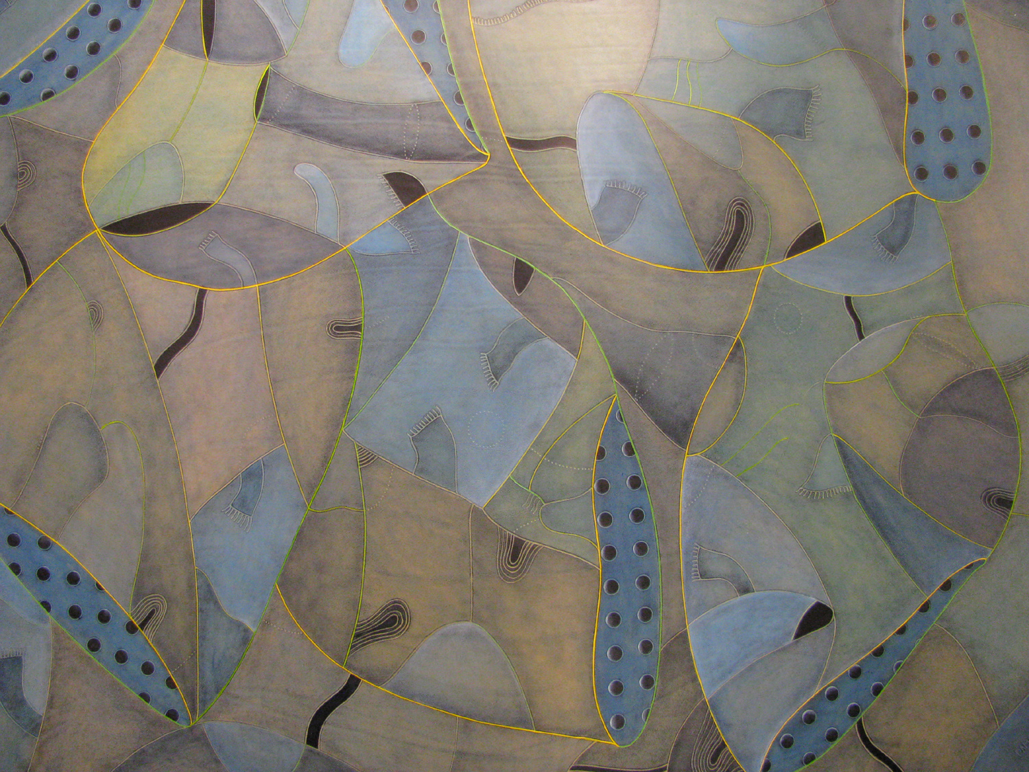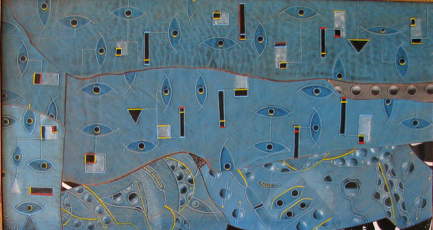 Linossiartstory: Die Arbeit „Der Betrachter und das Betrachtete“, ( Rindsleder bemalt ) ist auch sehr interessant. sind es Augen, die den Betrachter anblicken?