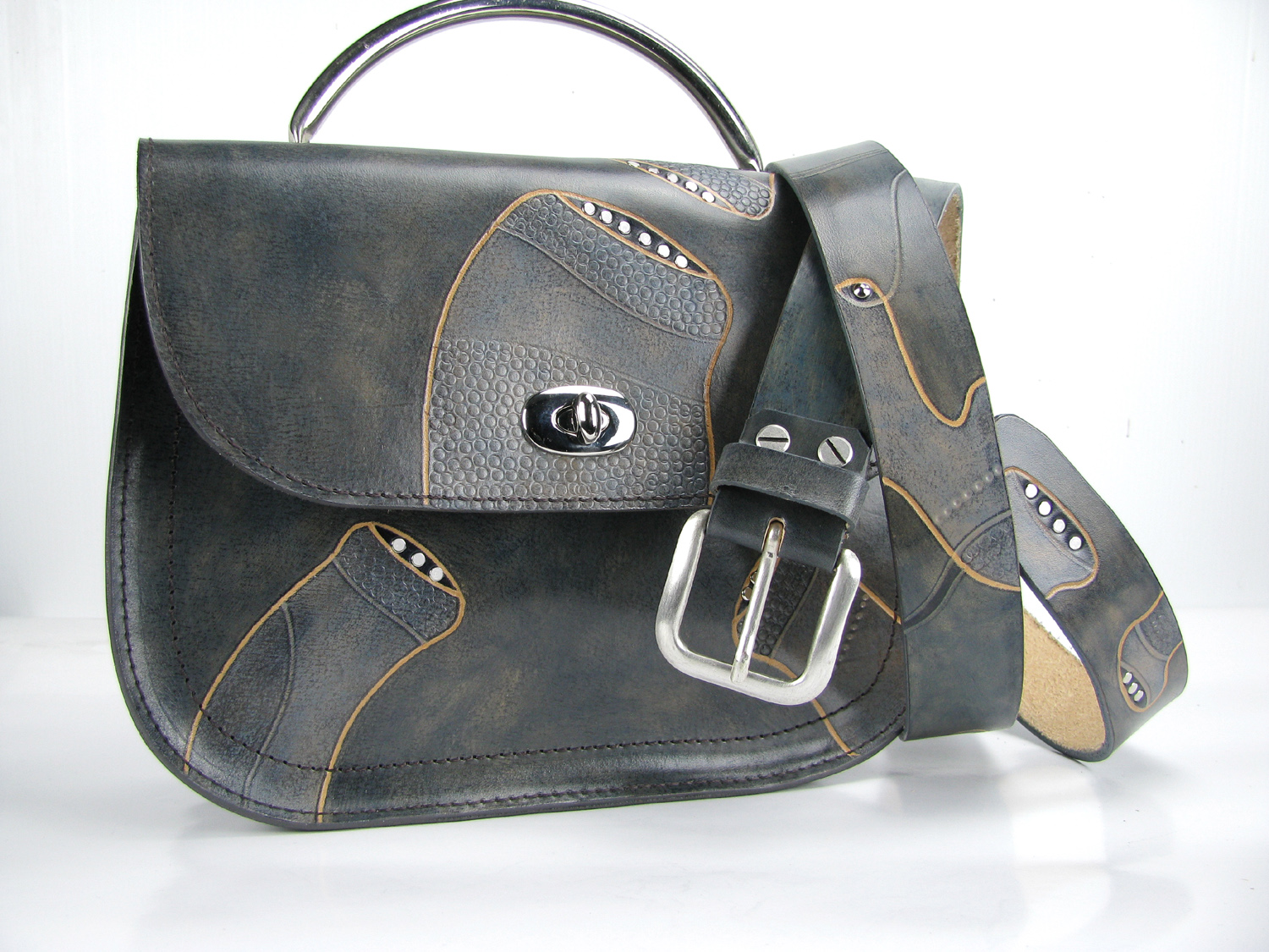 Markus Damini: Die vielseitige Anwendungsmöglichkeit des Leders ermöglichen es mir, verschiedene Gegenstände herzustellen. Das Leder ist ein edles Material und ich sehe meine Lederaccessoires als Schmuckstücke die auch praktisch sind und sogar, mit der Zeit eine andere – “durchlebte” Schönheit erhalten. Das Handwerk ist im Grunde eine andere Form der Kunst. Meine Taschen entstehen auf folgende Weise: ich zeichne und bemale große Lederteile, zerschneide diese Bilder nachträglich mittels Schablonen zu Taschenteilen, die ich dann variabel zusammennähe. Auf diese Art entstehen interessante und unvorhergesehene Resultate.