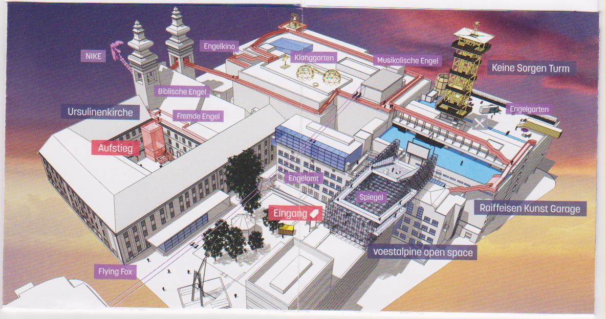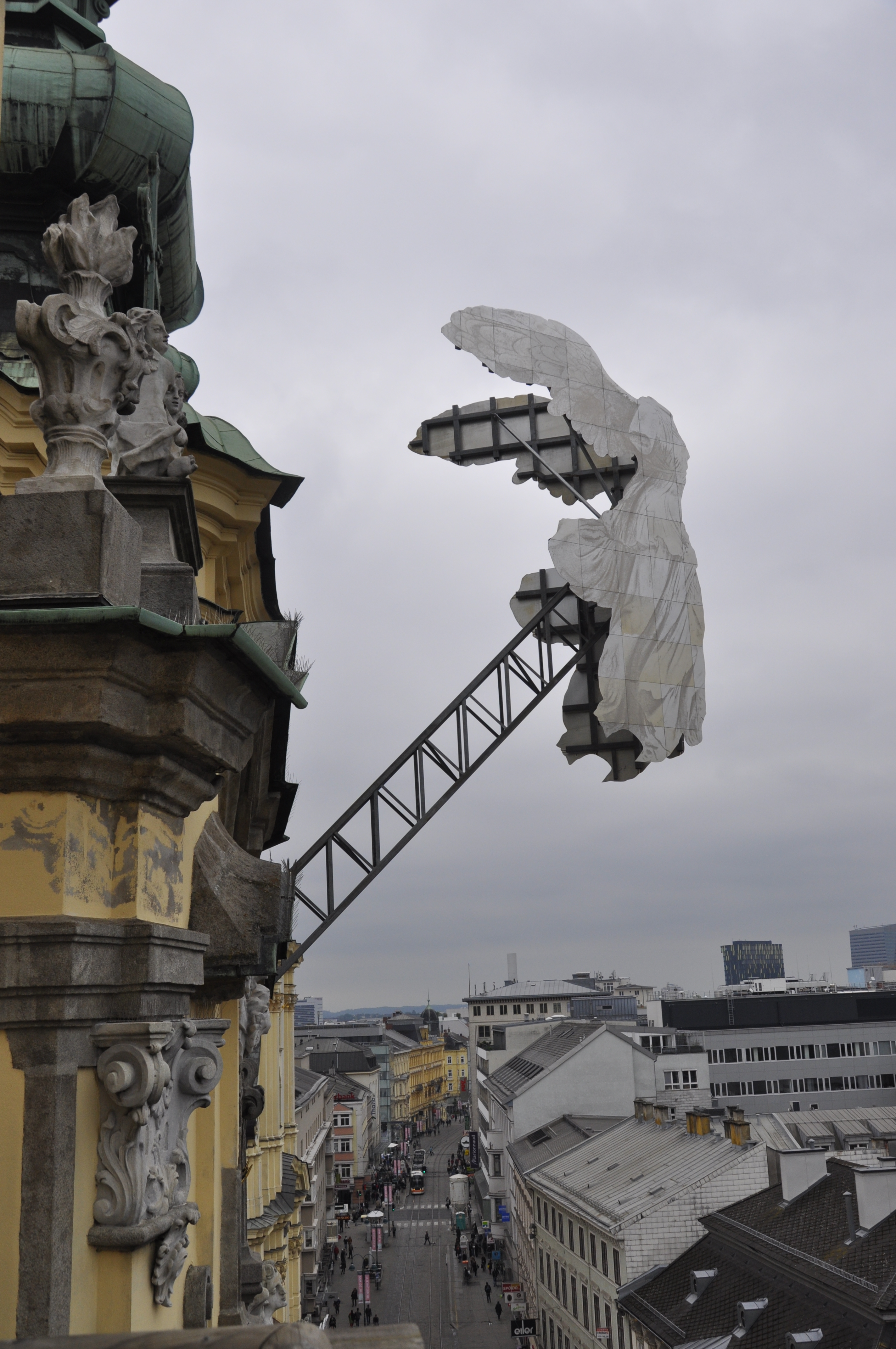 Zurückgekehrt ist auch NIKE die Nachbildung der antiken Siegesgöttin „Nike von Samothrake“ nach fast 40 Jahren der Architektengruppe Haus-Rucker-Co. Sie löste 1977 den größten Kunstskandal in Oberösterreich aus. Der 15m lange Kragarm der Aluminium-Plastik ist am Glockenturm der Ursulinenkirche montiert. So schwebt die Nike weithin sichtbar über der Landstraße. Als kopflose, geflügelte Nachbildung der „Nike von Samothrake“ . Sie erzählt über die heidnischen Vor-Bilder der biblischen Engel, woher sie kamen und wie sie sich verwandelt haben. Der „Fetzenvogel“, wie sie damals genannt wurde, dient nicht als nostalgisches Erinnerungsstück, sondern erhält eine neue, präzise Bedeutung bei der Suche nach anderen Engeln und feiert als Vorbild beim Höhenrausch 2016 vieler Engeldarstellungen nun seine vorübergehende Heimkehr.