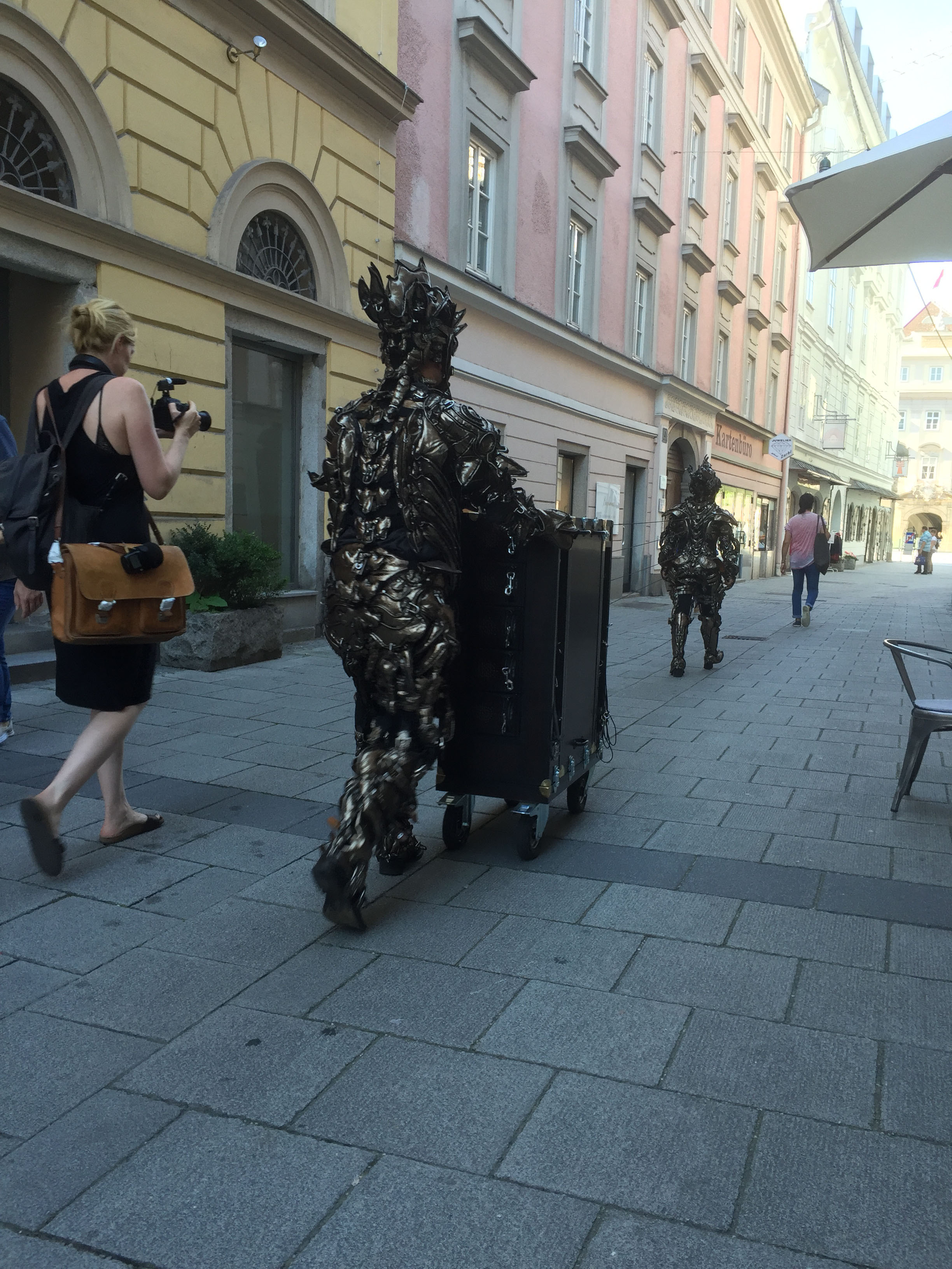 last but not least; als ich bei einem kühlen Bier in der Innenstadt von Linz saß, sah ich noch die acostume-sound-performance von Sarah Leimcke and Jens Vetter „Homo Restis“ Coole Sache.