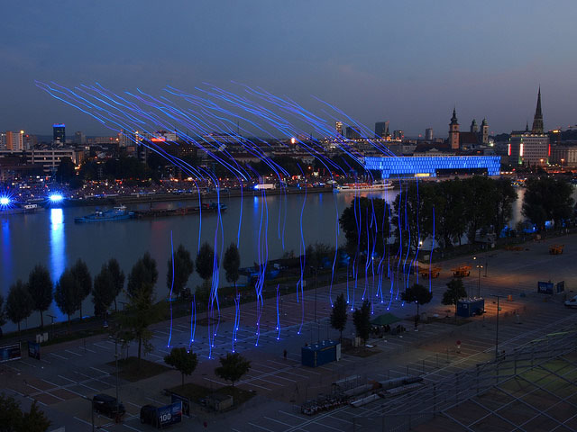 Die Klangwolke rundete schließlich traditionell den dritten Tag des Ars Electronica Festival mit imposanten Inszenierungen ab. Die Klangwolke muss man einfach einmal gesehen haben, es war eine Supershow. 1979 wurde nicht nur die Klangwolke gegründet, sondern auch das Ars Electronica Festival – ursprünglich als ein zusammenhängendes Event. Seit einigen Jahren entstanden jedoch zwei eigenständige Veranstaltungen, die aber bis heute am selben Wochenende stattfinden und sich nach wie vor ergänzen. Das Motto der Klangwolke wechselt jährlich. Diesmal war es „Fluss des Wissens“ – themengebend war die Johannes Kepler Universität, die mit dem Event ihr 50. Jubiläum feierte. Regie führte der international renommierte Medienkünstler Salvatore Vanasco.