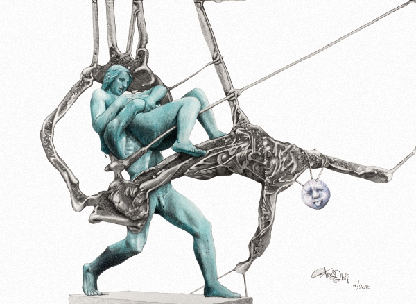 Wo immer er sie hin tragen wird, dies bleibt ein Geheimnis! Es stellt sich die Frage, hat es nur mit LUST zu tun oder ist auch BESITZ im Spiel? Im Anschluss an die Figuren erstreckt sich ein Körper wie ein Querschnitt – die ausgestreckten Arme oder sind es Äste – hängt höhnisch ein Kopf mit herausstreckender Zunge. Dieser Ausdruck scheint eine Verbindung zu der Skulptur herzustellen. Betrachtet man das Bild noch intensiver, könnte man auch meinen, der Liebespfeil von AMOR hat bei den beiden das Ziel verfehlt und es kam zu einer Entführung. Ein Werk, betrachtet man es noch länger, so entsteht ein enormer Denkprozess (so wie bei mir) und dies ist auch das Ziel des Künstlers. Ein Werk, das zwischen Gewalt und Nichtgewalt sich spiegelt und trotzdem eine gewisse Innigkeit ausstrahlt.