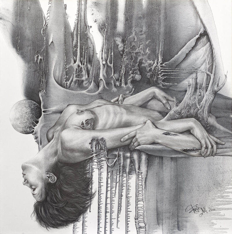 Zur Arbeit: Wurzeln der Liebe Eine Arbeit der vorerst eine Graphit-Schüttung vorausging, (Graphit wird durch Schüttung schwungvoll auf die Leinwand aufgetragen und somit entsteht ein explosiver Ausdruck) der Akt wird aus dieser Schüttung im Nachhinein herausgezeichnet. Aufgrund solcher Arbeiten, kann der Künstler nie konkret sagen, was daraus entstehen wird. Bei dieser Arbeit entwickelte sich ein weiblicher Körper, welcher Verletzungen aufweist. Jedoch diese Verletzungen wurden nicht gezeichnet, sondern entstanden aufgrund der Schüttung und Wolf ließ hier dem Körper seinen freien Lauf. Auch diese Arbeit hat viele kleine Details und man kann vieles hineininterpretieren. Eine Frau, ist es nur ein Schmerz oder doch ein Liebesschmerz, mit dem Wunsch abzustürzen, weil der Schmerz nicht mehr erträglich ist? Zwei ebenfalls verletzte Hände versuchen die Frau zu ergreifen. Vielleicht um sie zu retten? Offen ist auch, ob es sich um männliche oder weibliche Hände handelt. Franz Wolf gibt mir auch hier keine Antwort und so bleibt dies ein Geheimnis und dem Betrachter überlassen was er sieht. In Wolfs Arbeiten sind die Verwurzelungen auch immer wieder ein Thema. Auf die Frage zu den Wurzeln: Für ihn bedeuten Wurzeln, angekommen zu sein. In dieser Arbeit würde ich auch die Verwurzelungen mit dem Körper in Verbindung bringen. Franz Wolf schafft es in seinen Bildern immer wieder, die Leidenschaft, die Lust und die Begierde so wiederzugeben, dass man das Gefühl hat, dabei zu sein.