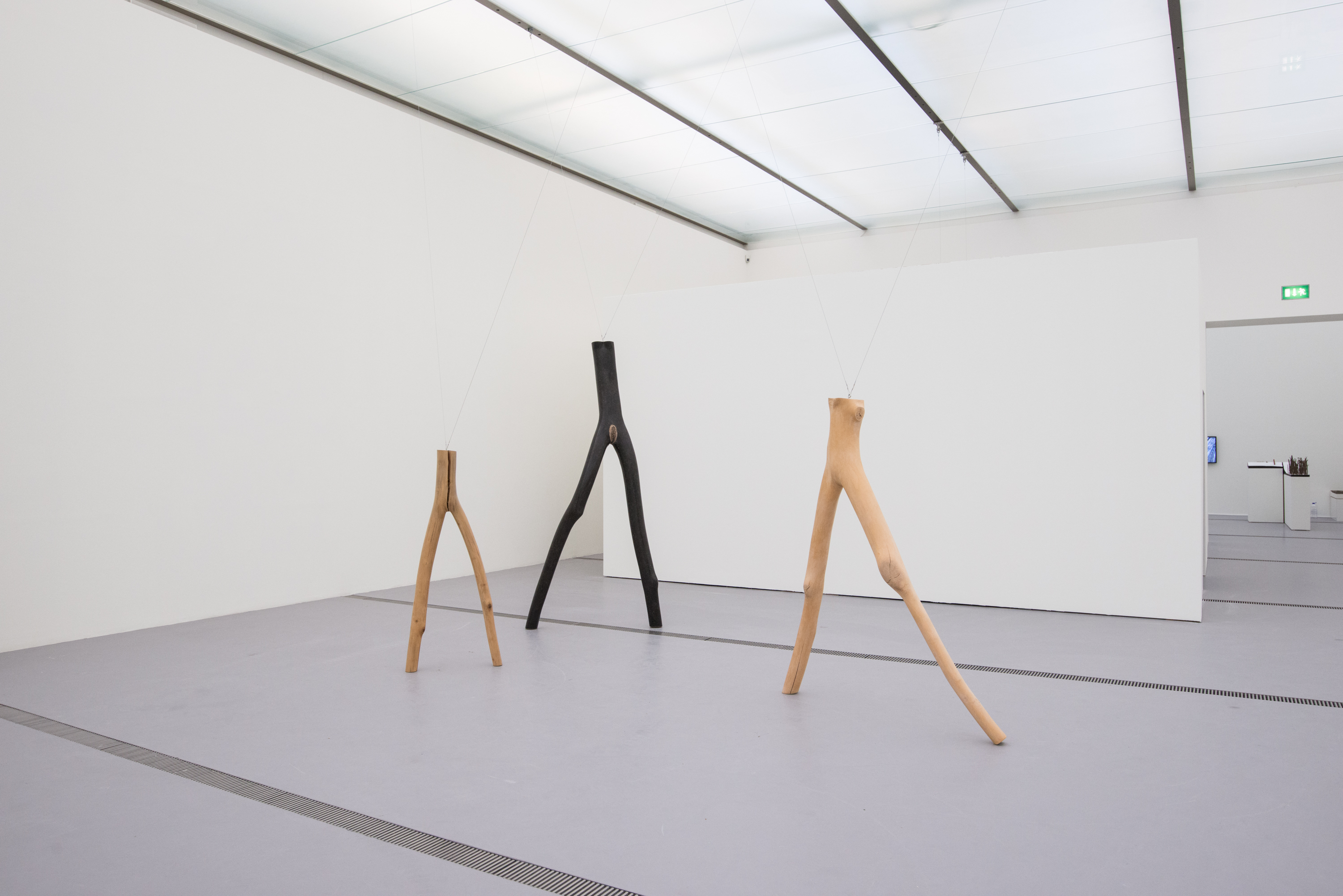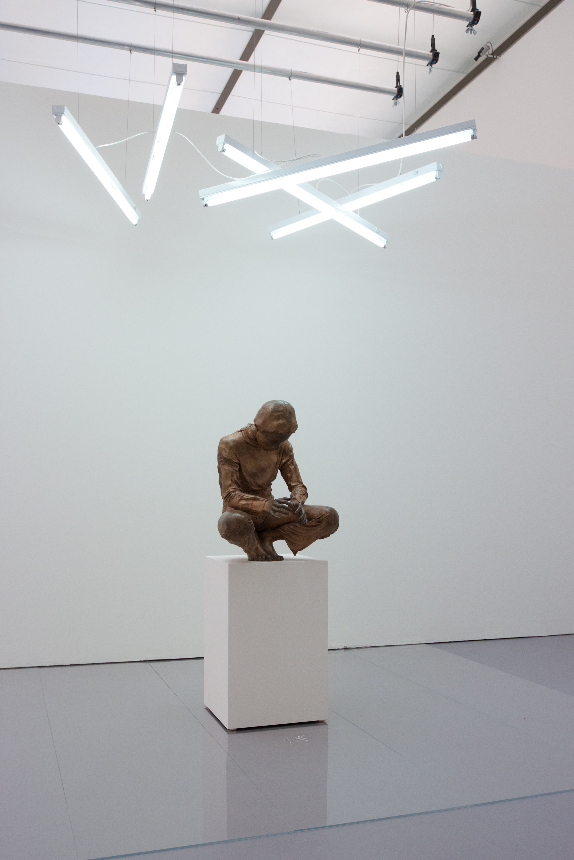 Besonders in Auge gestochen ist mir die „Lichtinstallation BTV“, eine Arbeit aus dem Jahr 1982. Diese dreiteilige Installation besteht aus einer Skulptur eines hockenden Jungen. Bei dieser Skulptur handelt es sich um Bechtolds Sohn, der ein Bronzeabguss ist. Dieser Knabe schaut auf seine Hände, durch die soeben Streichhölzer zu Boden gefallen sind. Die Streichhölzer die am Boden liegen, haben die gleiche Anordnung wie die Leuchtstoffröhren an der Decke, die sich wiederum im Boden spiegeln.