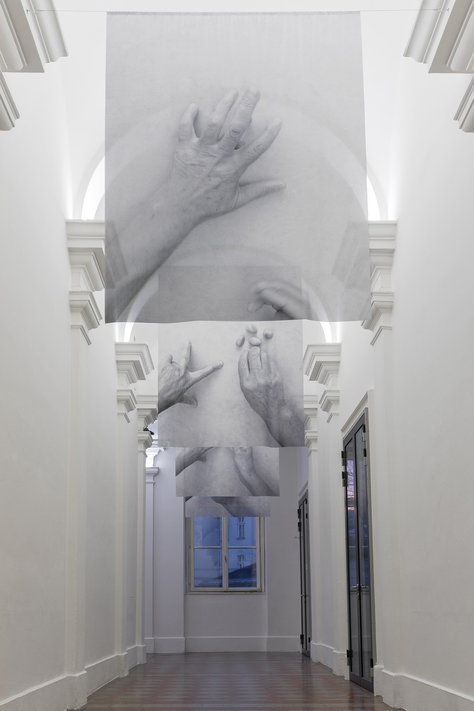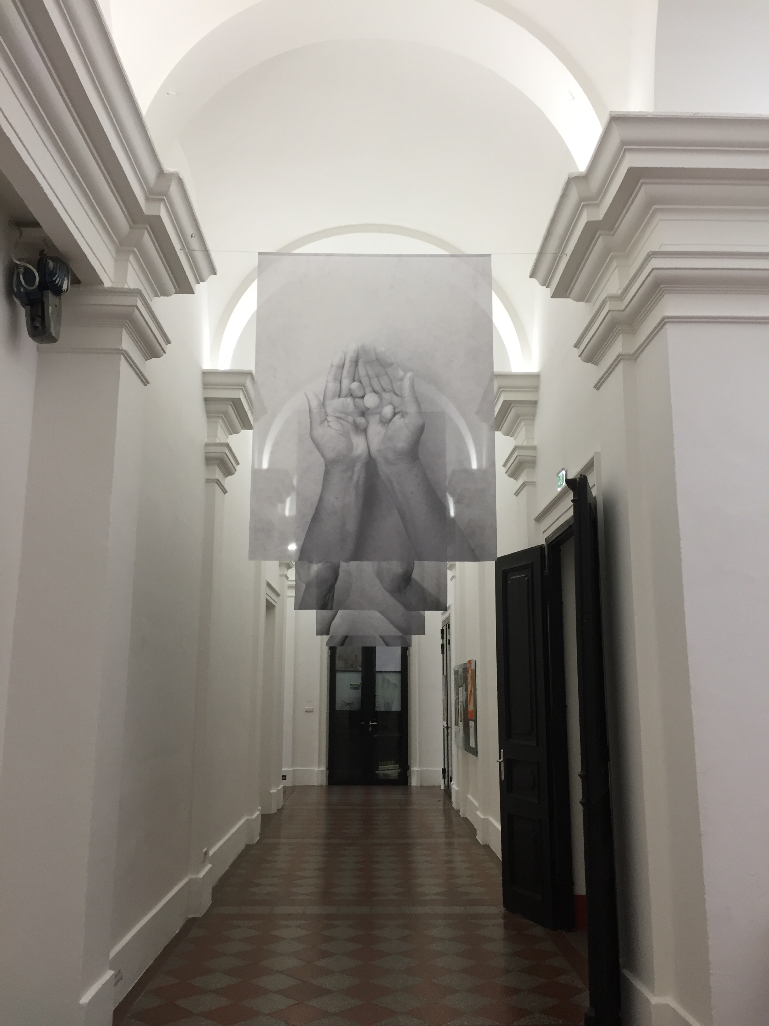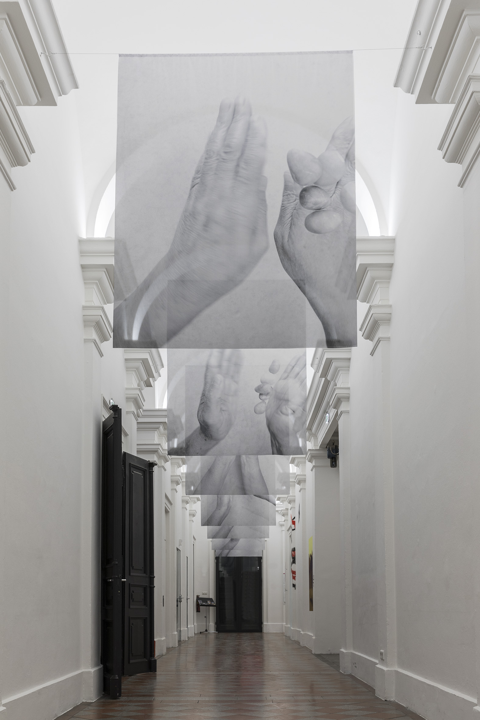 Interessant an dieser Installation ist auch, egal aus welcher Richtung sie die Banner betrachten, sie sind auf Grund des Prints jeweils Spiegelverkehrt auf der Vorder- oder Rückseite. Die Künstlerin hat bewusst „Hände“ gewählt. Hände sind für den Menschen ein sehr wichtiges Werkzeug, mit denen Produzieren wir, mit denen umarmen wir, mit denen trösten wir usw. Für uns Menschen ist immer alles so selbstverständlich und trotzdem muss man sich gewisse Dinge immer wieder ins Bewusstsein rufen, was wäre wenn….