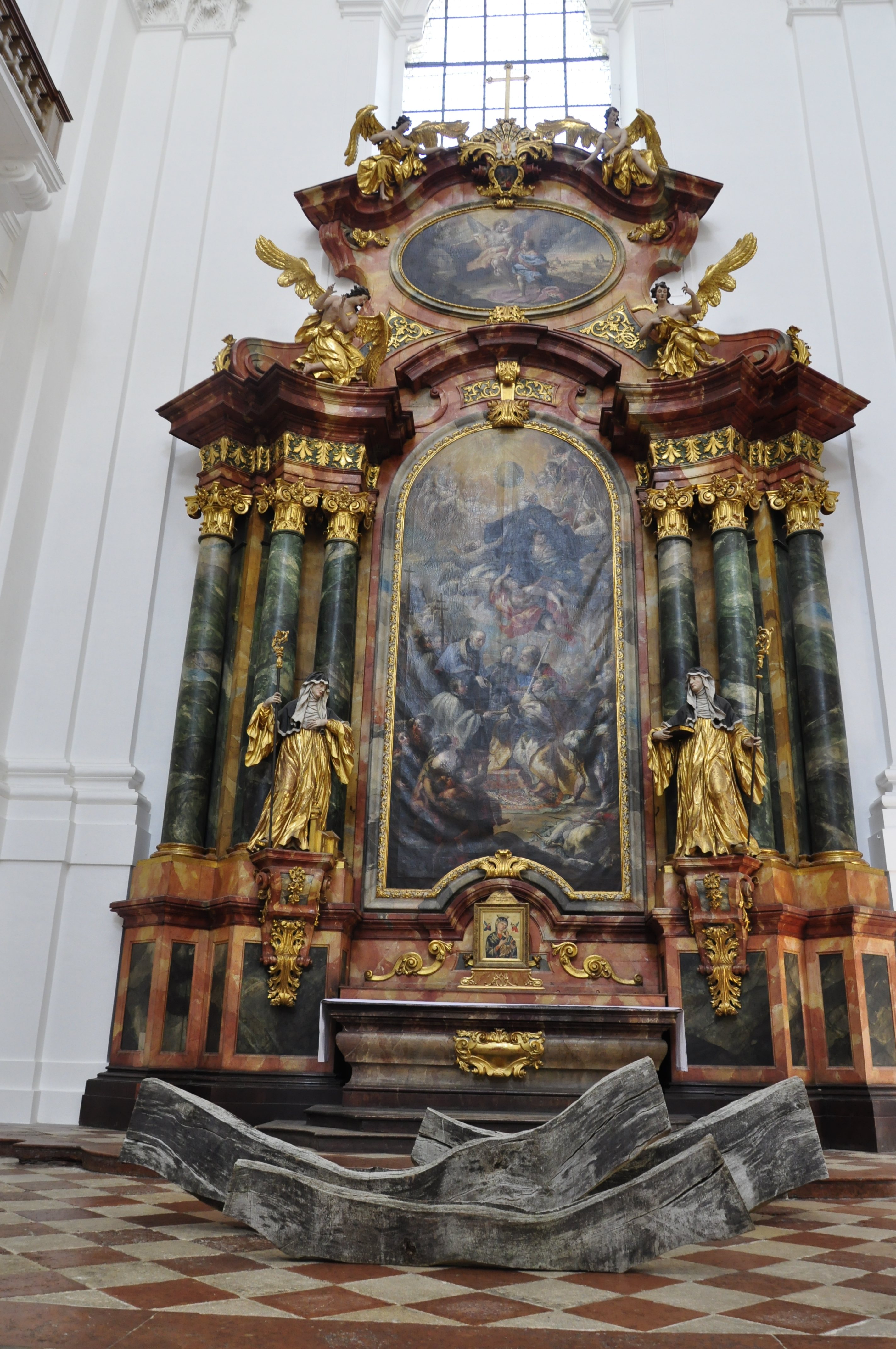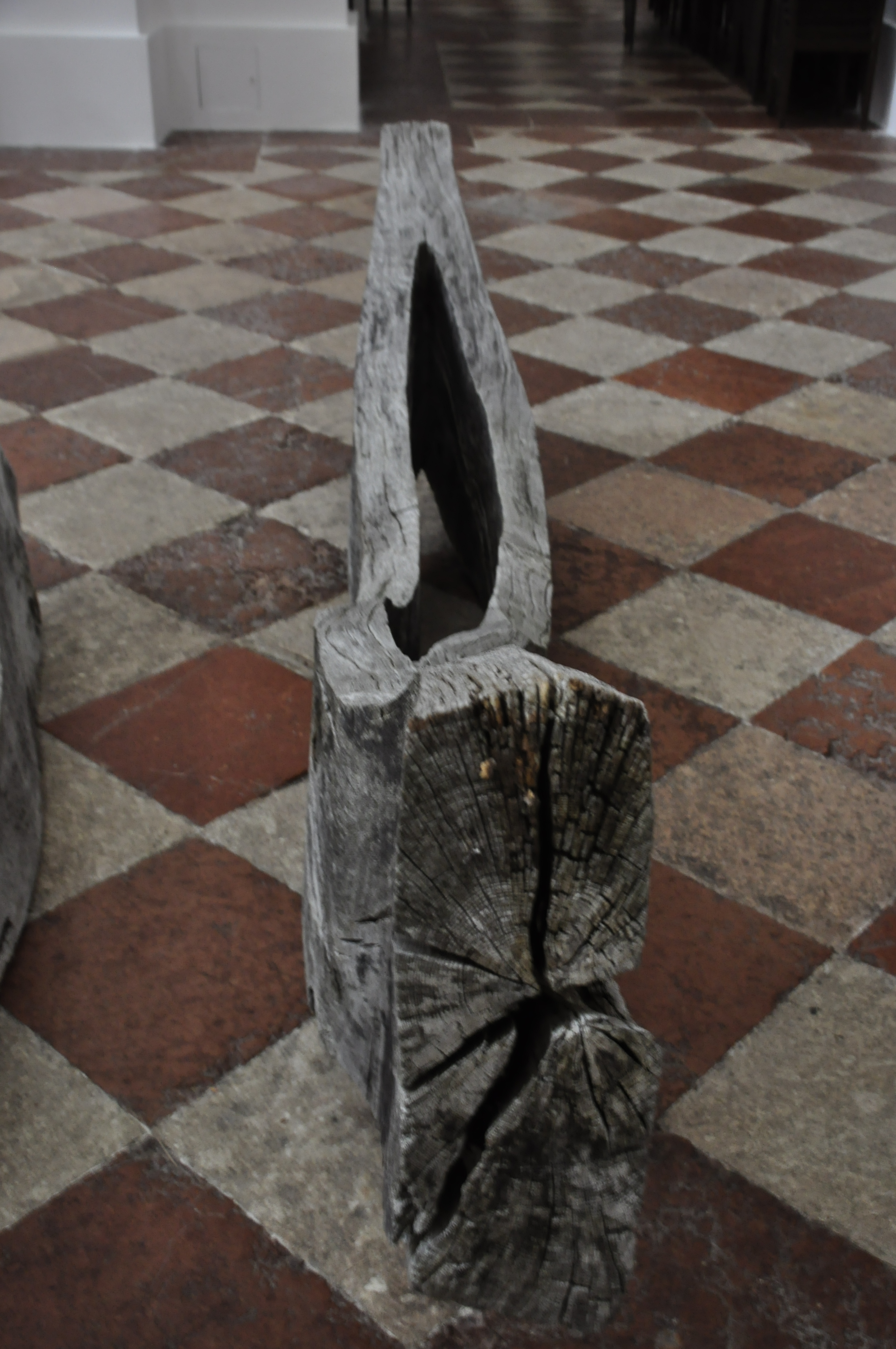 Die Arbeit „Weathered Vessels“ angeordnet vor einem Seitenaltar, es handelt sich hier um verwittertes Eichenholz. „Weathered Vessels“ eine Metamorphose, bei genauer Betrachtung, kann man erkennen, wie die Struktur des Holzes sich aufgrund der Verwitterung sich veränderte. Dieser Prozess wird durch Pilzbefall und klein Lebewesen unterstützt und führt so zum Verfall des Holzes.
