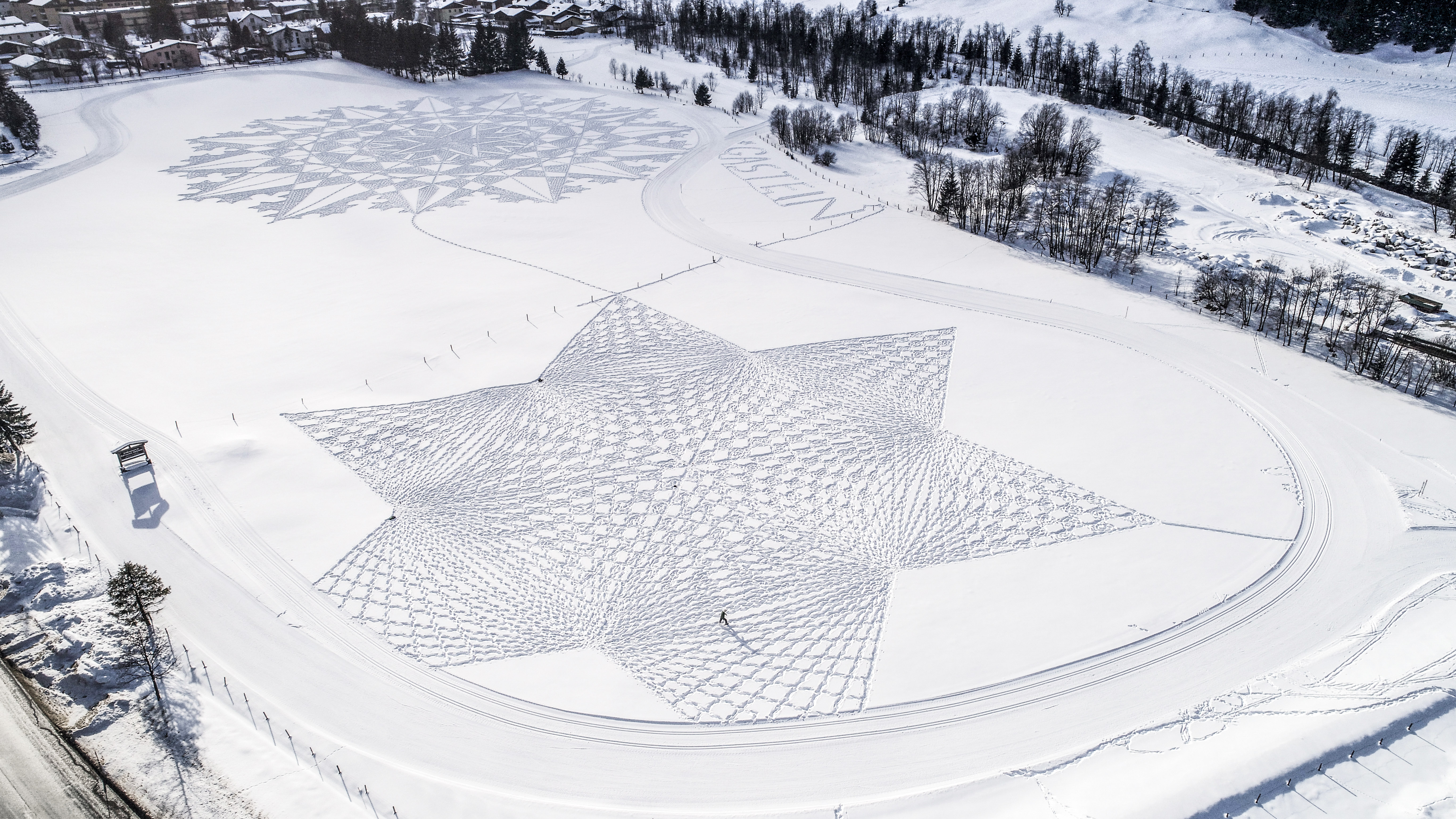 Da ist zB der weltbekannte britische Künstler Simon Beck http://snowart.gallery/ der Schnee-Malereien in die Winterlandschaft zaubert. Schnee-Malerei? Wie funktioniert es? Es handelt sich hier um überdimensionale Kunstwerke im Stil von Kornkreisen, welche der Künstler einfach mit seinen handelsüblichen Schneeschuhen erzeugt. Bewaffnet mit Kompass und Schneeschuhen tritt er Schritt für Schritt riesige Bilder und Symbole in die Landschaft, die natürlich oft nur aus der Luft – oder aus der Seilbahn – richtig zu erkennen sind.