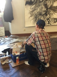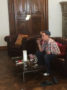 Jona Cerwinske war bei der Vernissage anwesend. Cerwinske ist ein Künstler, bei dem man schmunzeln muss, er lag auf dem Sofa in der Galerie zugedeckt und rastete sich vornehmlich aus. (Zum besseren Verständnis, die Galerie Budja ist wie ein Wohnzimmer, wo man sich wohlfühlt, mit Ledersesseln, Coach, Kamin, einer Bar und rundherum Kunstwerke)