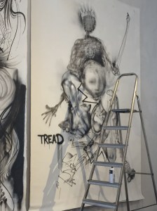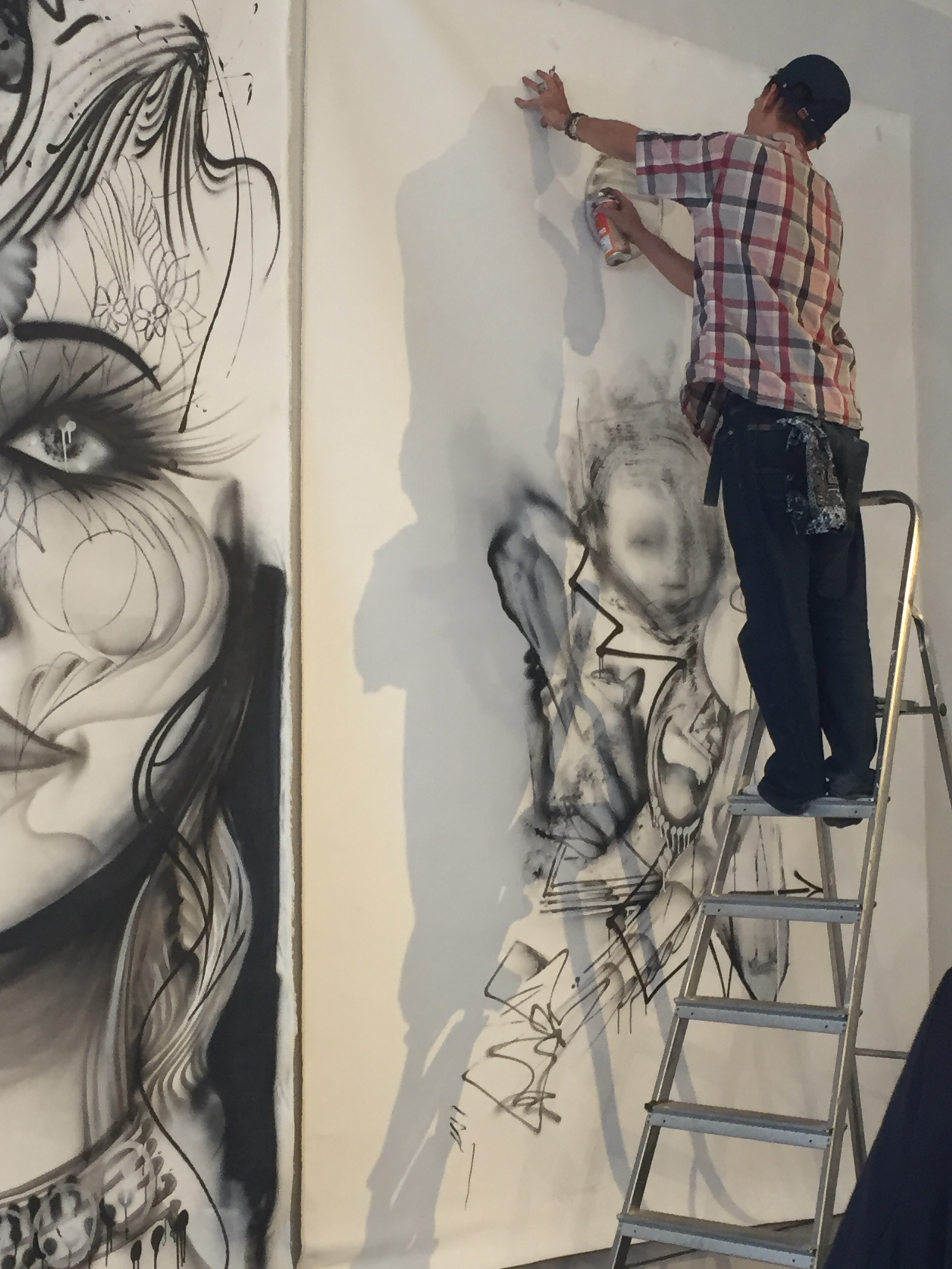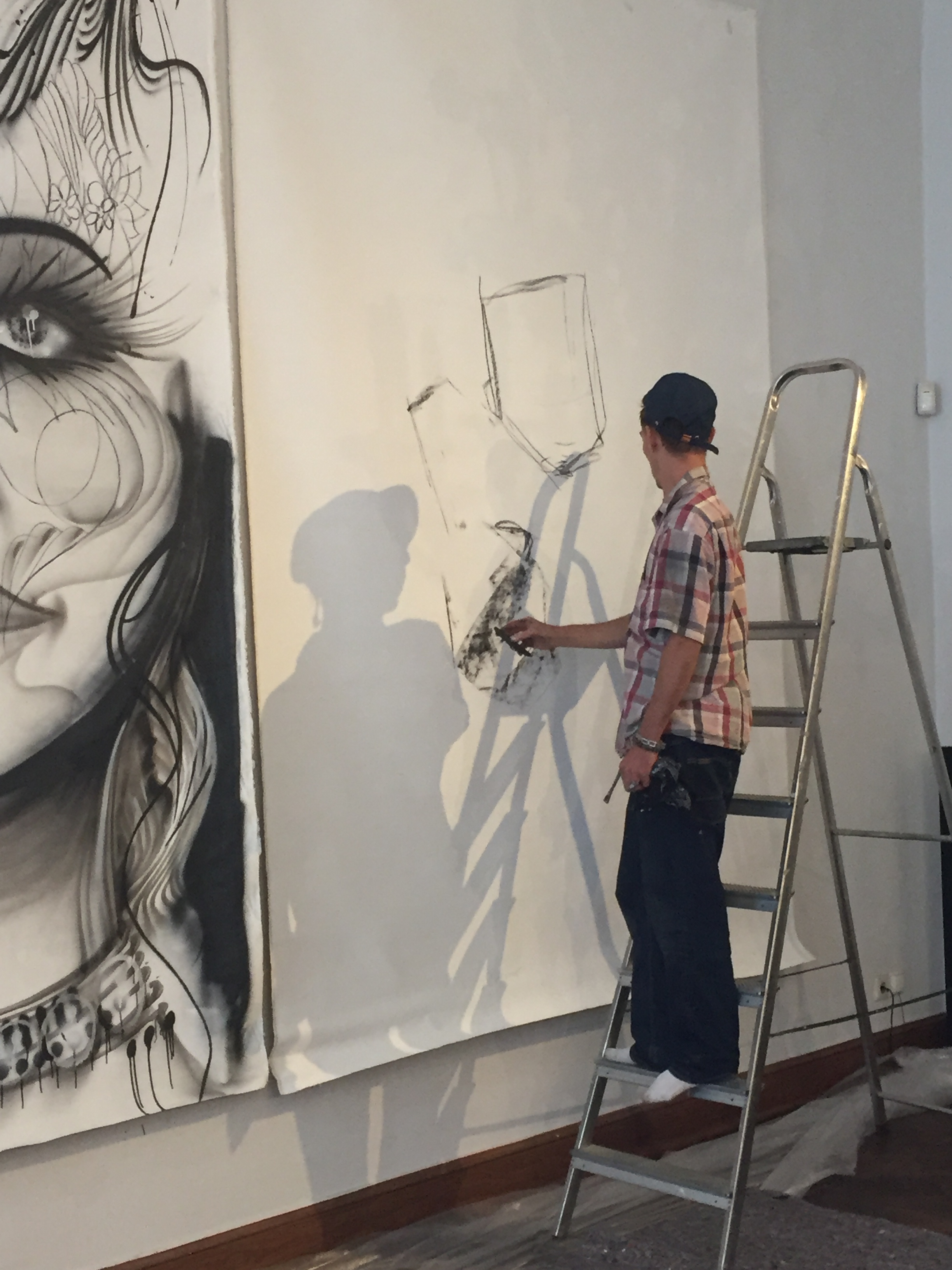 Die Vernissage war für 14 Uhr angesetzt, der Künstler erhob sich und nahm ein Gläschen Wein zu sich, dazu eine Zigarette und ignorierte die Besucher der Vernissage. An der Wand eine Leinwand im Großformat, zu der sich der Künstler mit seiner Graffiti Spraydose begab und begann die Konturen für eine Zeichnung vorzubereiten. Es war auf alle Fälle interessant ihm zu zusehen. Mit wenigen Strichen wurde das Kunstwerk auf die Leinwand gesprüht.