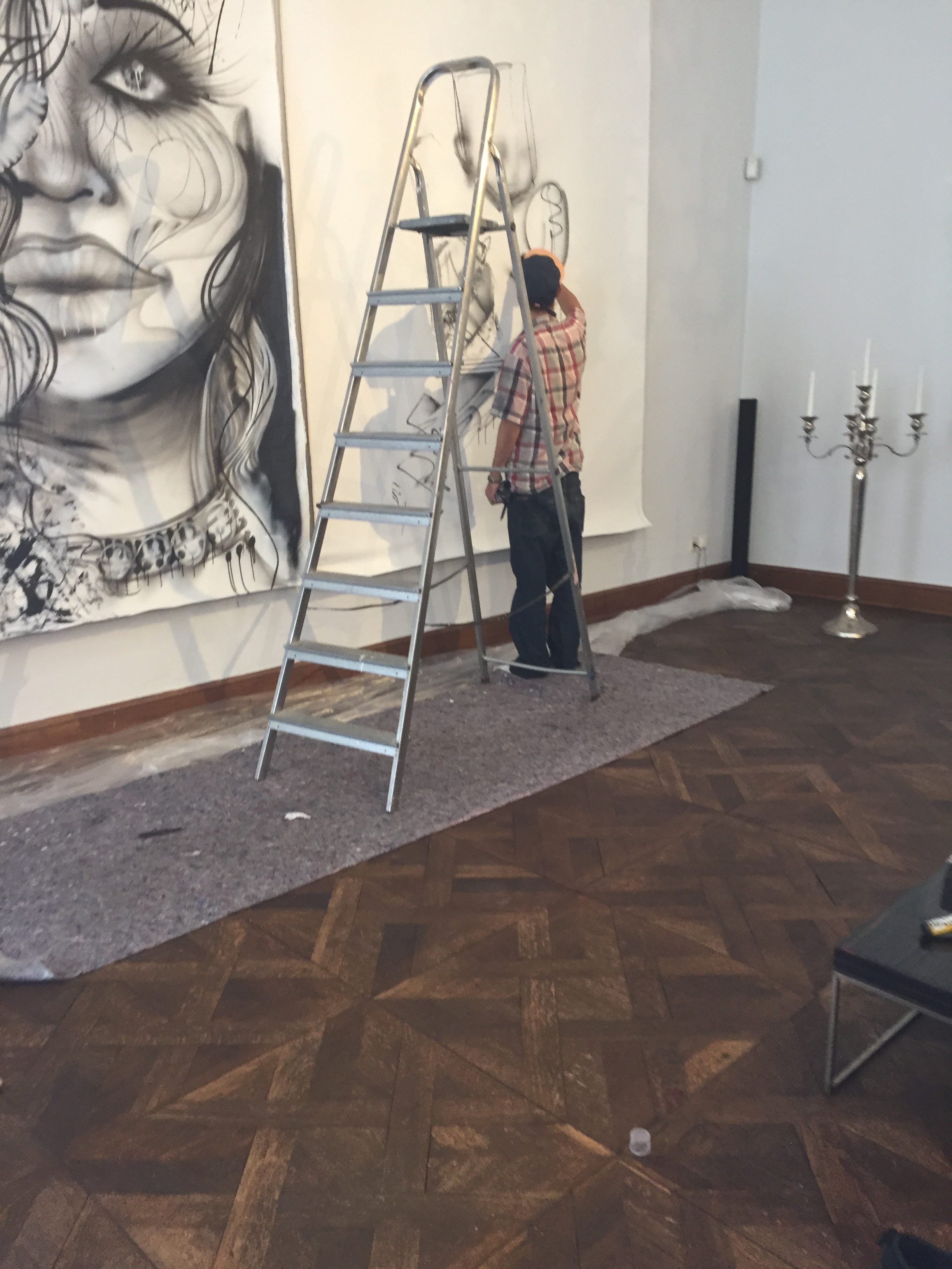 Zwischendurch verschwand der Künstler immer wieder, kam wieder, begab sich auf die Leiter, arbeitete weiter, bereitete zwischendurch eine neue Spraydose vor und die Arbeit ging zügig voran. Nach einer Stunde war es fertig das Kunstwerk oder auch nicht, den der Künstler verschwand wieder in andere Räumlichkeiten und ich verschwand aus der Galerie.