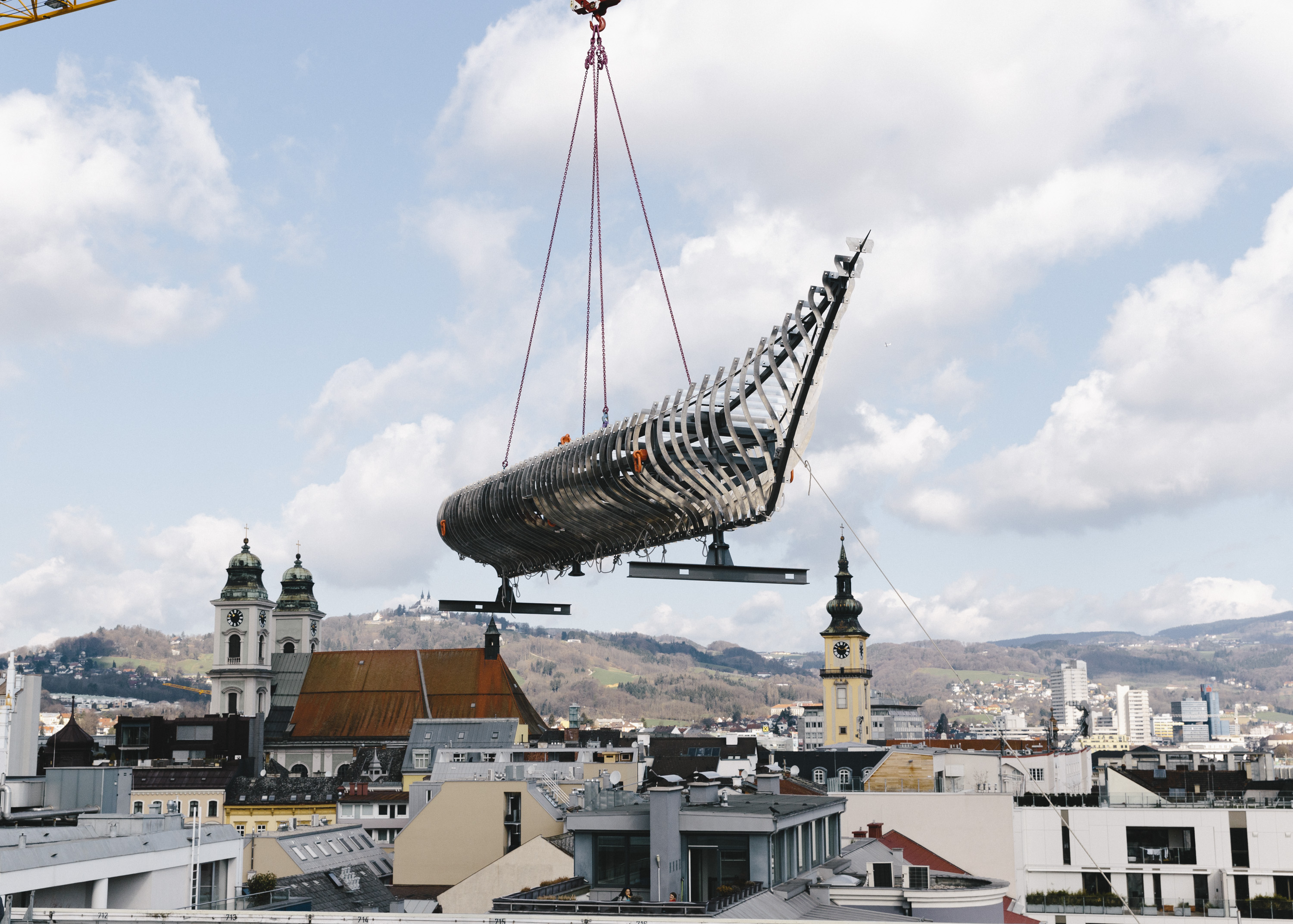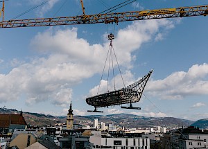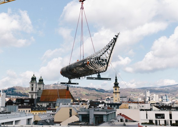 Freitag dem 06.04.2018 ist in Anwesenheit des Künstlers Alexander Ponomarev das „FLYING SHIP“ am Dach der Raiffeisen KUNST GARAGE gelandet.