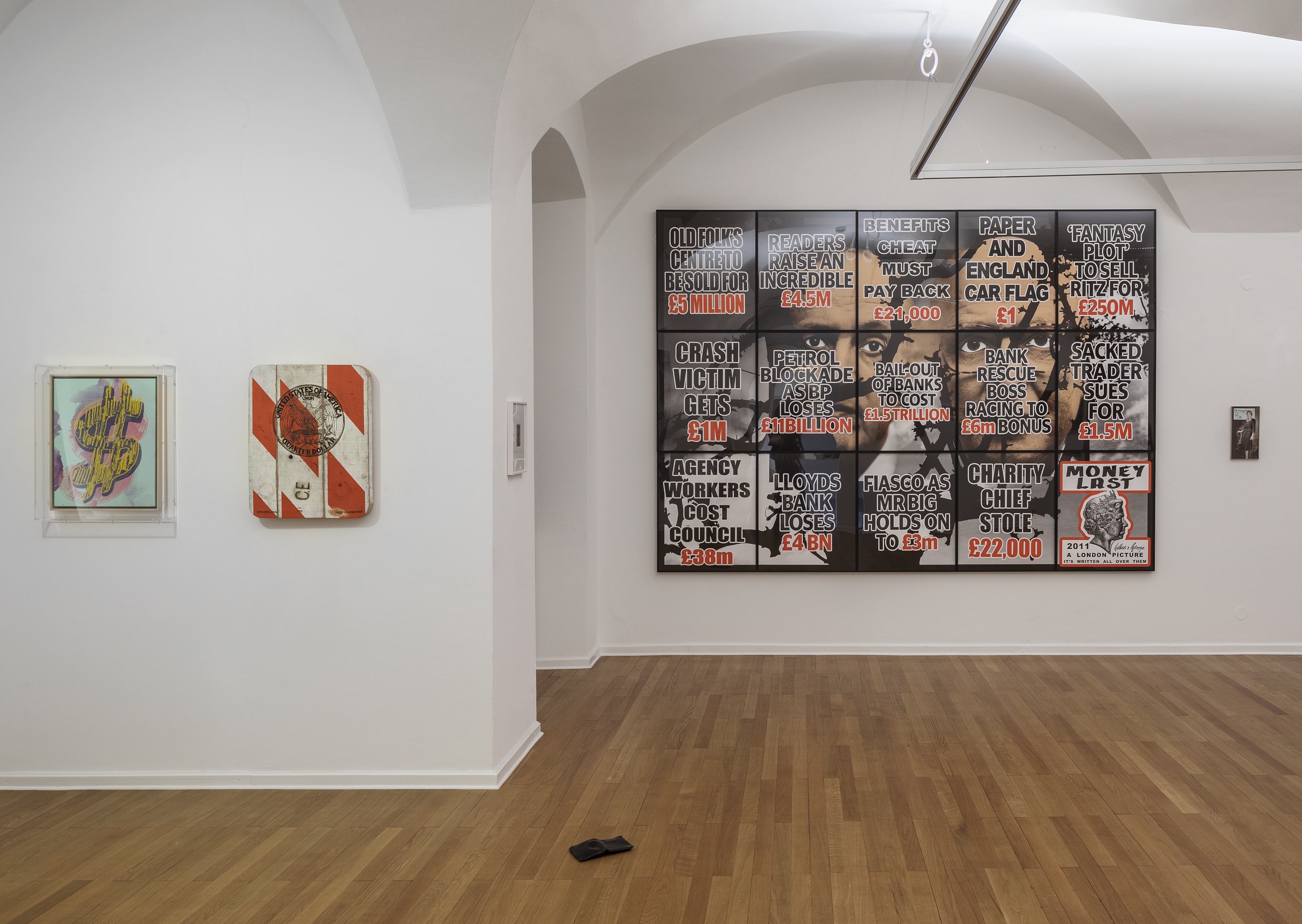 So erhielt sie von der Galerie Ropac eine Leihgabe des Werkes von Gilbert & Georg, die eine Arbeit mit Bezug zum Geld machten. Es handelt sich hier wieder um eine Arbeit in Form des Rasterarrangement (15 Bilderrahmen zusammengeschlossen) welche auf Geld Bezug nehmen. Ein paar Textauszüge wie zB: „Flasco as Mr Big Holds on to £3m“, „Charity Chief Stolle £ 22.000“ oer „Crash Victin Gets £ 1m“, im Hintergrund des Werkes sieht man wieder Gilbert und George. Auch ein echter Andy Warhol mit einer Arbeit des Dollarzeichen kann man in der Galerie sehen. Ebenfalls eine Leihgabe der Galerie Ropac.