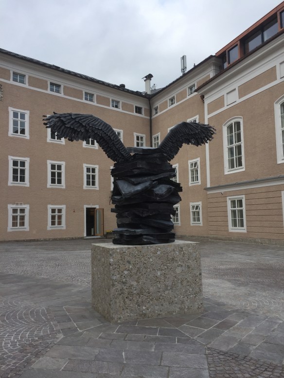 Majestätische Adlerschwingen erheben sich über den Stapel Bücher, als würden sie einen Schatz bewachen. Oder überwacht der Adler den Salzburger Landtag? Anselm Kiefer der sich viel mit Mythen und historischen Figuren beschäftigt, setzte sich in diesem Fall mit Fulcanelli (https://www.historicmysteries.com/who-was-fulcanelli/) auseinander und „Die Sprache der Vögel“ ist somit das Ergebnis dieser Auseinandersetzung mit Fulcanelli, das Pseudonym eines französischen Autors alchemistischer Schriften in den 1920er Jahren.