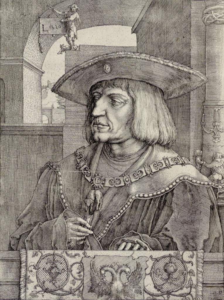 Die Darstellung des Heiligen Römischen Kaisers Maximilian I., entstanden zum Gedenken an seinen Tod im Jahr 1519, gilt als technisch innovativstes Werk von Lucas van Leyden. Es zeigt, wie zum ersten Mal in Europa ein Künstler die Techniken des Ätzens und Gravierens kombinierte. Der Künstler gravierte Maximilians Gesicht mit sehr feinen, scharfen Linien, aber die weniger starren und etwas lebhafteren Striche im Rest der Komposition wurden geätzt.