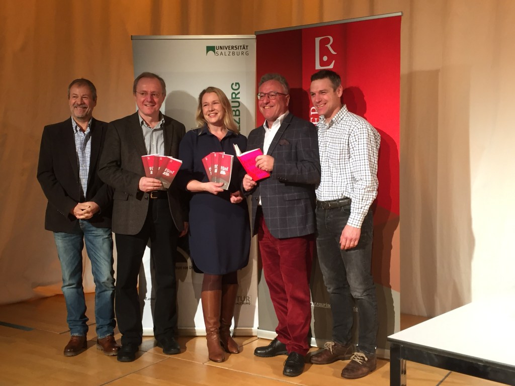 Pressekonferenz „Rauriser Literaturtage“ am 3.2.2020 von links nach rechts: Herbert Mayer (Kulturverein Forum Rauris) Manfred Mittermayer (Intendanz d. Rauriser Literaturtage) Ines Schütz (Intendanz d. Rauriser Literaturtage) LH-Stv.Heinrich Schellhorn und Peter Loitfellner Bürgermeister Marktgemeinde Rauris Foto: Christa Linossi