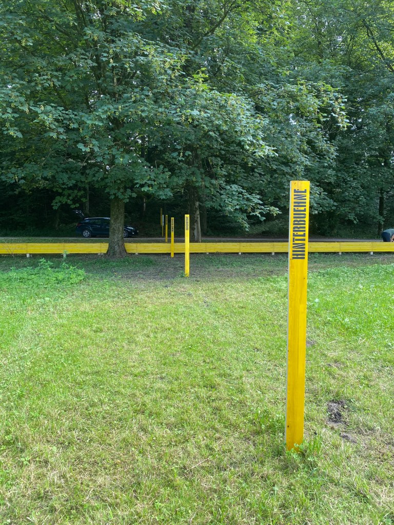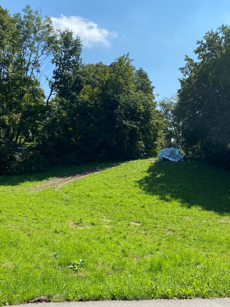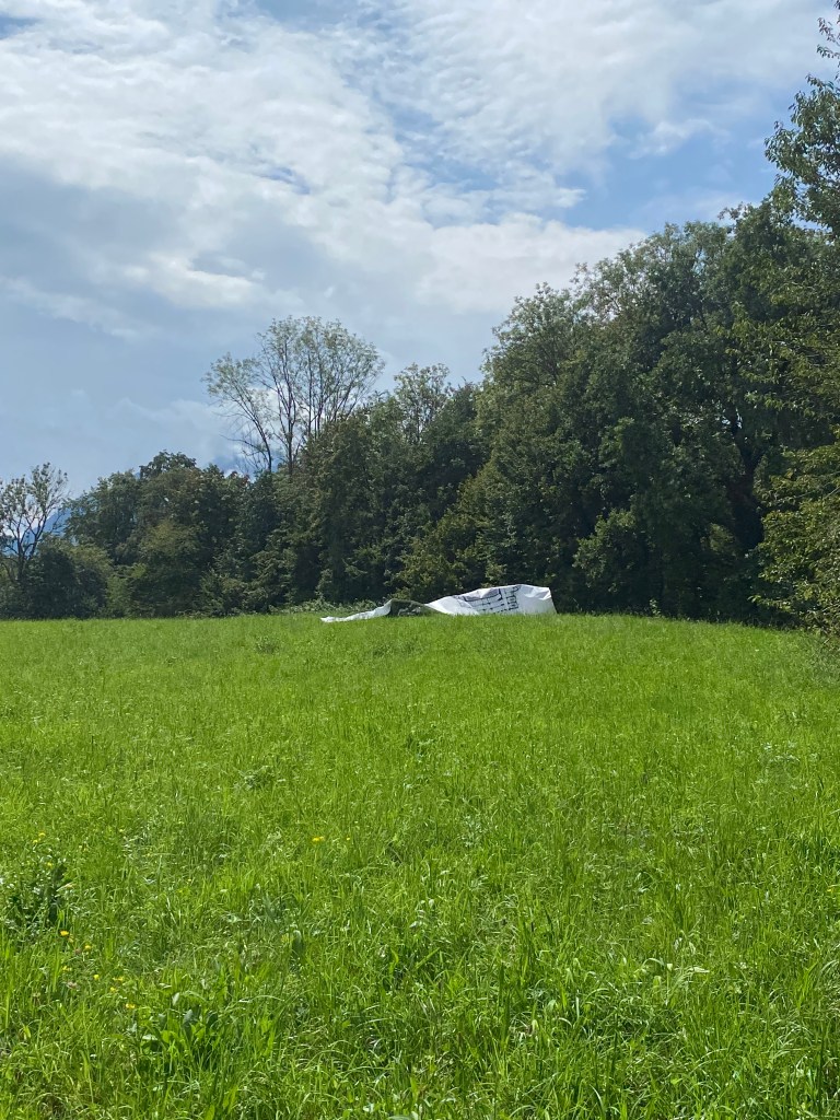 Hier muss ich noch nachhacken. Beim zweiten Anlauf fand ich auch die dritte Skulptur, allerdings versteckt hinter einem Hügel und auch nur, weil ich einen anderen Weg gegangen bin. Dieser Weg wird eventuell vereinzelt von Besucher*innen in Anspruch genommen. An dieser Skulptur kam dann zufällig ein Pärchen vorbei, die ich geradewegs darauf ansprach, ob sie wissen, vor was sie stehen. Nein, war die klare Aussage, sie dachten es sei eine Plane, die irgendwie hier herumlag und sich im Wind bewege. Ich sagte Fehlanzeige, es handelt sich um ein Kunstwerk und ich klärte auf. Das Pärchen waren ebenfalls Künstler (Berliner), jedoch machten sie einen Kurzurlaub in Salzburg um Handkes Stück „Zdeněk Adamec“ zu sehen.