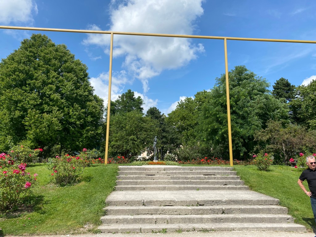 Auch das Objekt von Isa Rosenberger Portalrahmen am Rosenhügel – es sieht imposant aus und ist es auch – wenn man sich vorstellt, wie dort das Festspielhaus seinerzeit hätte sein sollen. Aber auch hier, sehen die Besucher*innen kein Kunstwerk darin, sondern einfach einen Rahmen, der vermutlich hierhergehört.