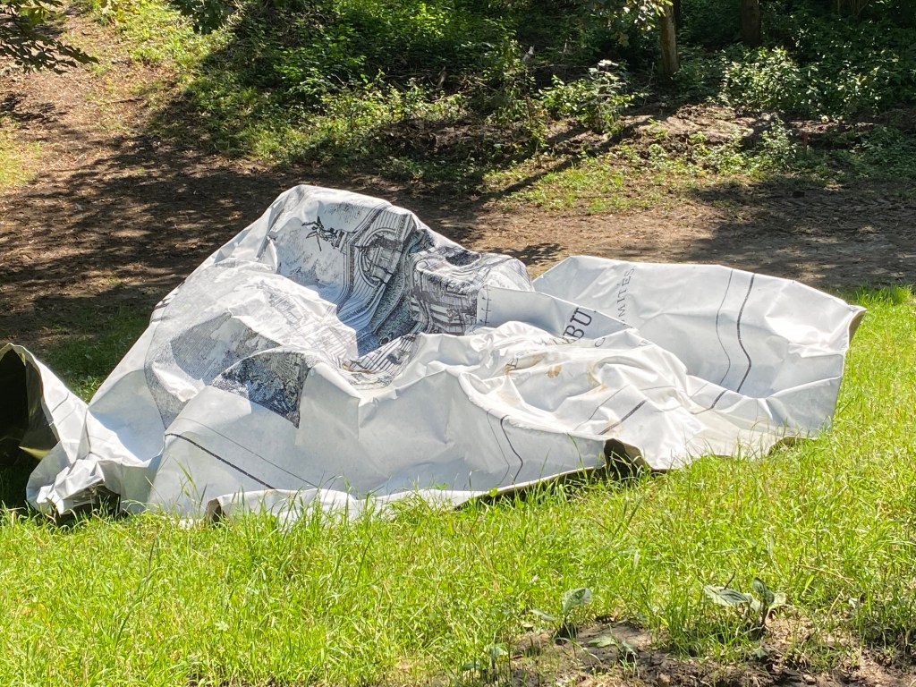 Eine Hinweistafel befindet sich am Wiesenrand und informiert über die Skulpturen. Die Arbeit ist wirklich gut und interessant, wie ein zerknülltes großes Papier (allerdings aus Aluminium) liegt es am Hang Rand, als nicht verwertbare Idee, etwas dahinter, liegt die zweite Skulptur, ebenfalls zerknittert und lieblos hingeworfen, wie ein Dichter, der seine Idee als unbrauchbar sah, das Papier zerknüllte und auf den Boden warf. Aber wo ist die dritte Skulptur? Auf dieser Skulptur befindet sich ein Plan, diese Skulptur hatte ich noch nicht gefunden, obwohl ich die Umgebung fotografierte.