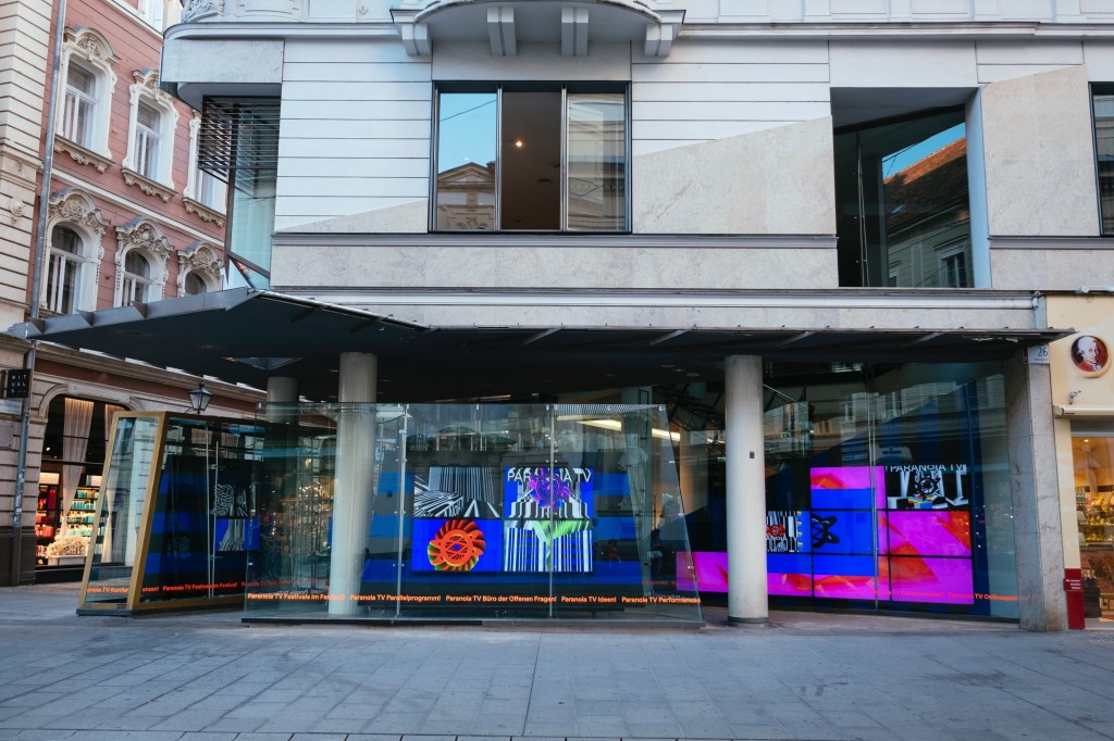 So wurde die traditionelle Eröffnungsrede von Ekaterina Degot dieses Jahr auf 99 Bildschirmen in der Innenstadt von Graz und natürlich, was den ansonsten, auf Paranoia TV übertragen.