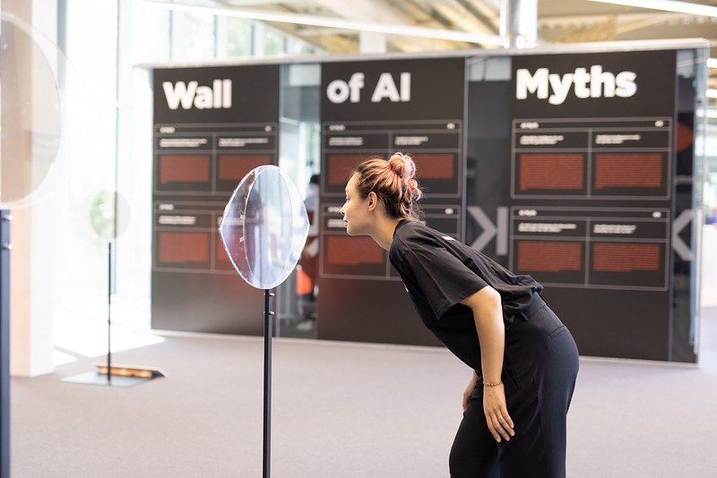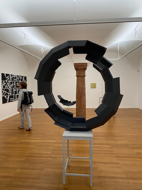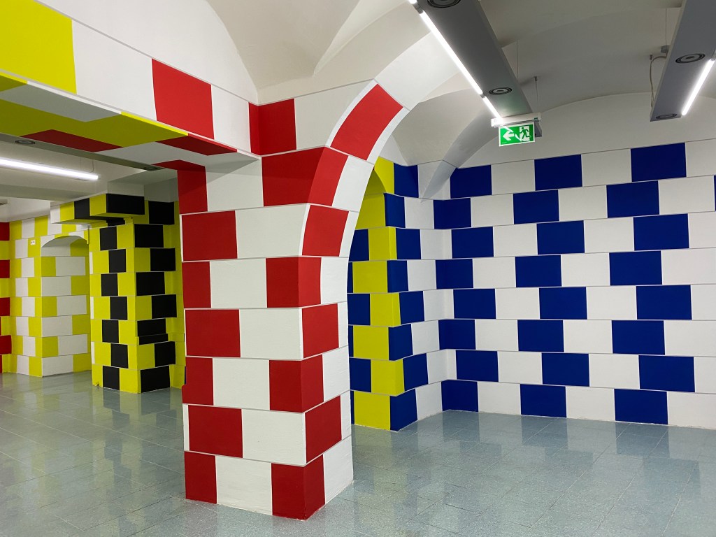 Es sind noch weitere interessante Kunst-Installationen zu sehen, wie zum Beispiel im Besucher: innen- und Pressezentrum von Peter Schloss mit „Grupa Ee“. Um was handelt es sich hier? Hier hat der Künstler in seinen formal-minimalistischen Arbeiten einen Versuch zu einer präzisen Vermessung der Welt gestartet. Es sind Erkenntnisse und wie die uns täuschen können. Seine Kollaboration mit dem Kollektiv Grupa Ee bewegen sich seine Arbeiten zwischen Design und künstlerischer Intervention. Es handelt sich hier um eine berühmte optische Täuschung, die erstmals 1898 beschriebene Café-Wall-Illusion. Was ist das bitte genau? Die Café-Wall-Illusion ist eine visuelle Wahrnehmungstäuschung, bei der Rechtecke trapezförmig erscheinen. Es geht hier auch um Farbillusionen, geometrische Illusionen. In all diesen Fällen scheint unser Sehvermögen falsche Annahmen des Sehreizes zu treffen. Optische Täuschungen beruhen auf der Tatsache, dass die Wahrnehmung subjektiv ist und vom Gehirn beeinflusst wird.