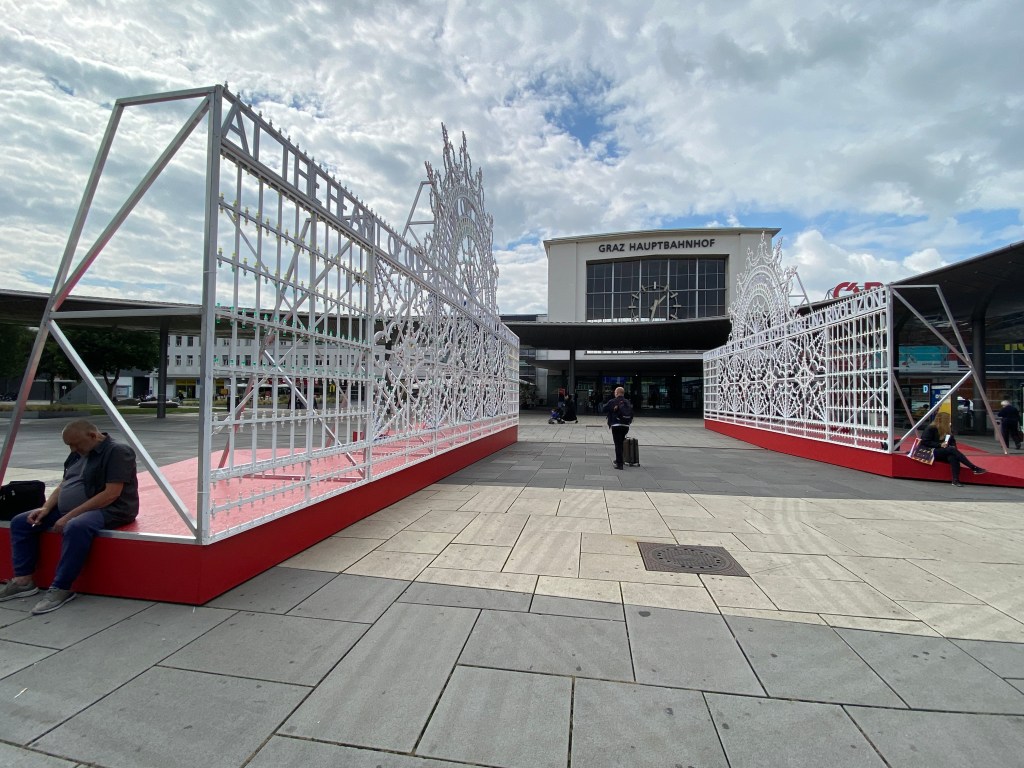 Beginnen wir mit dem Hauptbahnhof, dort werden die Menschen schon mit einem kunstvoll gestalteten Tor empfangen. Es deutet auf diese Welt in der Kunst und Leben ineinander übergehen und sie das eine von dem anderen nicht immer unterscheiden können. Das Kunstwerk Assembly schuf Marinella Senatore, eine multidisziplinäre Künstlerin, die sich durch eine starke partizipatorische Dimension und einen ständigen Dialog zwischen Geschichte, Popkultur und sozialen Strukturen auszeichnet. Ihre Installation besteht aus bunten Lichtern und gleicht am Abend einem beeindruckenden visuellen Feuerwerk und beleuchtet somit am Abend den Bahnhofsvorplatz.