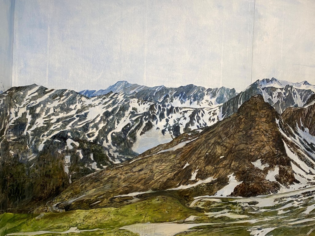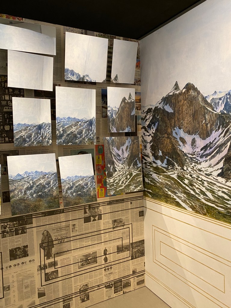 Der Raum oder wie die Künstlerin es nennt: „Room of Sublime Wallpaper“ sieht man auf der linken und rechten Seite des Raumes eine gemalte Berglandschaft, es handelt sich hier um den Großen St. Bernhard, einen Pass in den Walliser Alpen, dessen Erscheinung zahlreiche Maler der Romantik beeindruckt hat. In diesem Raum sind an der Stirnwand Spiegeln installiert, die wiederum reflektieren das Bild des Passes in Richtung der Betrachterinnen. Diese Spiegel erschaffen wieder eine Reihe von „Gemälden“, die nicht dem Verkauf unterworfen sind, sondern als Kommentar zu unserer komplexen Beziehung zur Landschaft fungieren.