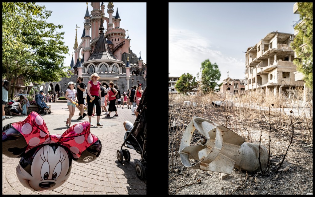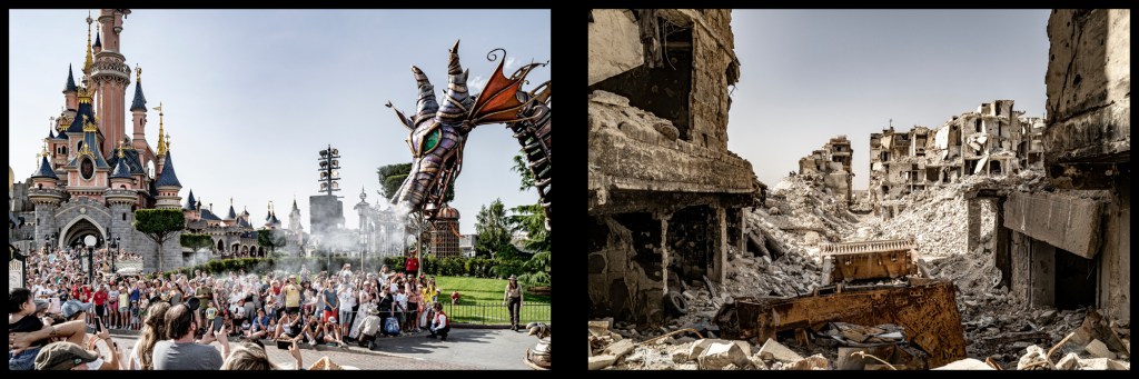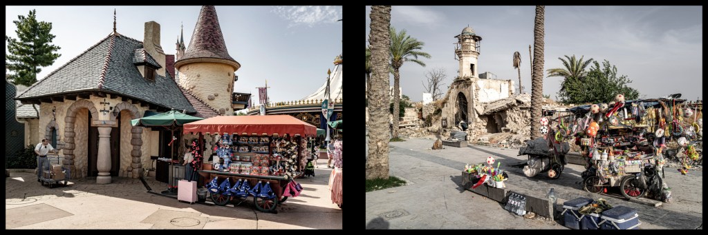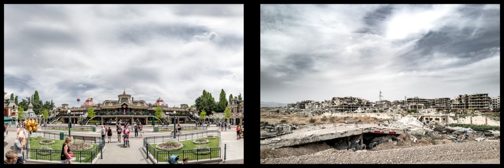 Linossiartstory: Eine Fotoarbeit regt insofern zum Nachdenken an, ein Verkaufsstand im Disneyland und ein Verkaufsstand vor einer Ruine in Syrien. Es ist dies der krasse Unterschied, von der abgehobenen künstlichen Welt in Paris und dem zerstörten Allepo.