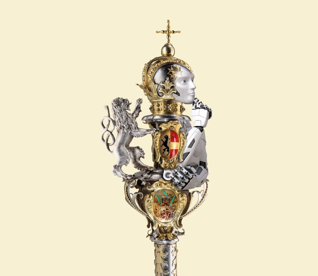 Das Sujet der Jubiläumsausstellung verbindet Vergangenheit und Zukunft, Tradition und Wandel: so auch das Universitätsszepter mit dem vorwärtsgewandten Silberlöwen des Universitätsgründers, der im neuen Logo der PLUS aufgegriffen wird, erlebt eine Metamorphose zum Roboter, der in die Zukunft blickt.
