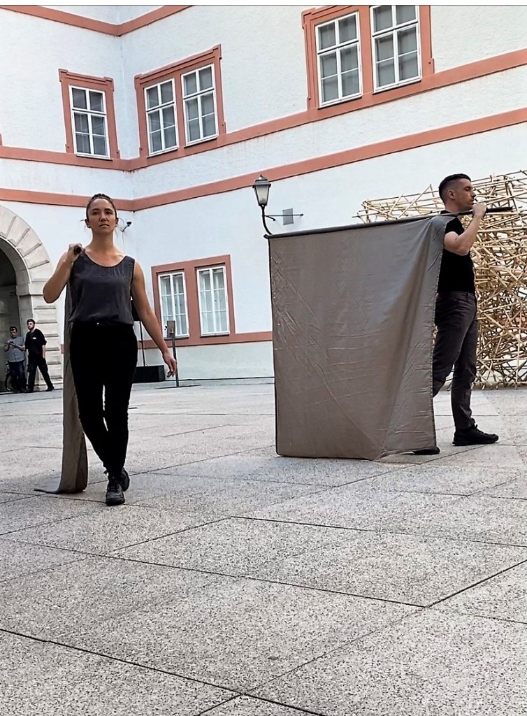 Das Duett A E R E A von Ginevra Panzetti und Enrico Ticconi betraten in Zeitlupe den Innenhof des Salzburg Museums und mit ihrer Fahne, dessen Funktion es von jeher war, Ideen von Zugehörigkeit und Trennung zu vermitteln und den Unterschied zwischen fiktiven „wir“ und einer Gruppe von „anderen“ zu markieren. Im Innenhof des Salzburg Museum angekommen, läuft im Hintergrund so eine Art akzentuierter Sound, der dem Zuschauer ein Szenario, von Geschichten erzählt und Mythen erschafft und Macht inszeniert.