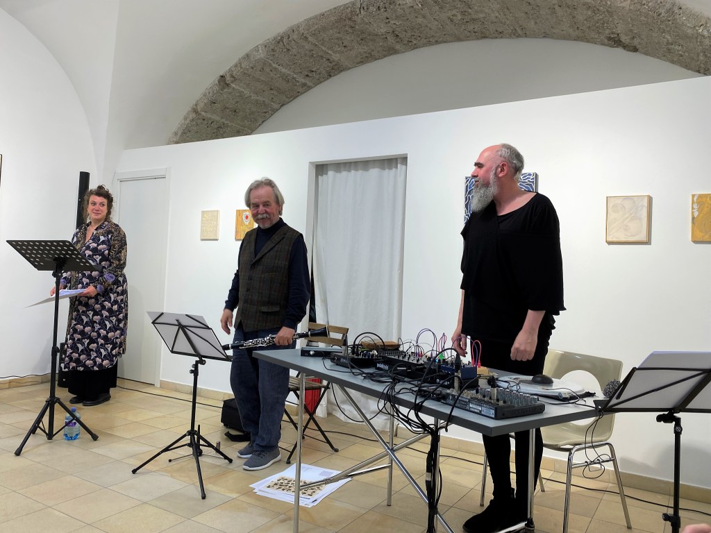 In der Galerie Sophia Vonier inszenierte man eine Musik Performance. Der Klarinettist, Komponist und Zeichner Renald Deppe – er hatte jahrelang mit Friedrike Mayröcker zusammengearbeitet – hat zu Textfragmenten Mayröckers kalligraphische Partituren angefertigt, die einmalig live vertont wurden. Die Nebengeräusche waren auf alle Fälle gewöhnungsdürftig, die mit der Klarinette und dem Gesang wieder auf eine hörbare Welle gebracht wurde.