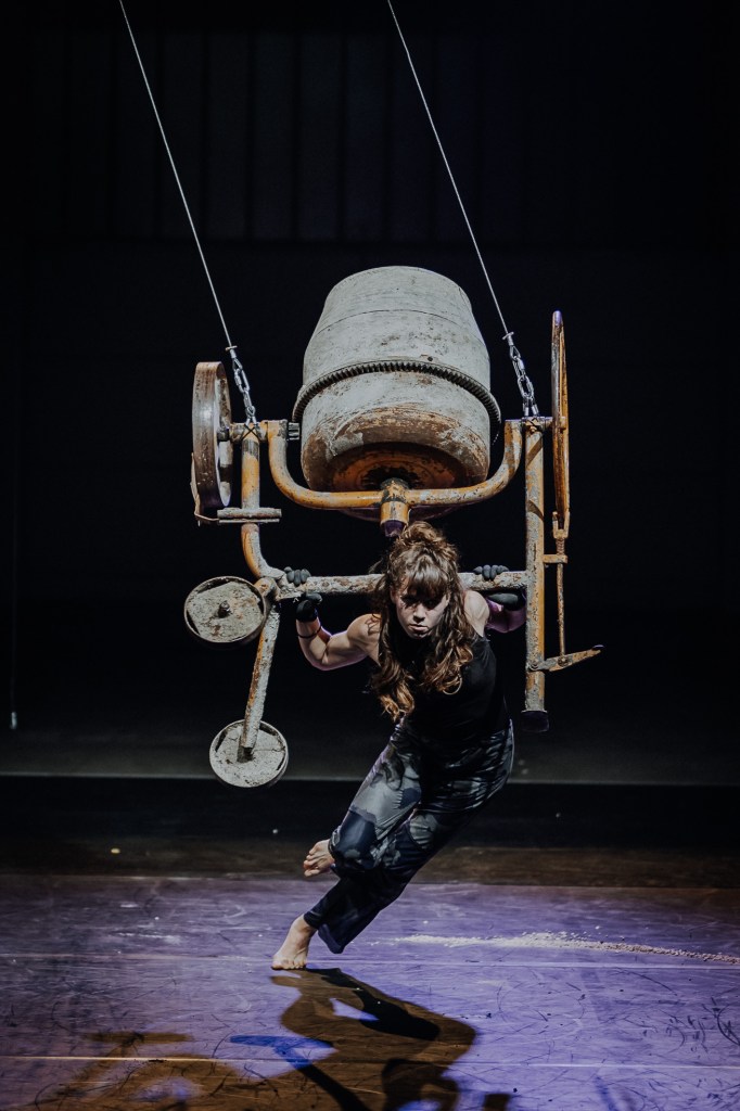 Zur Performance in der SZENE, 4 Tänzer*innen und als weiterer Hauptdarsteller eine Mischmaschine. 2 Tänzer mischen auf der Bühne als Einstieg einen Zement an, den sie dann in zwei viereckigen Formen gießen und darin Schuhe mit einzementieren. Was dies zu bedeuten hatte, keine Ahnung, am Ende der Aufführung kamen die einzementierten Schuhe wieder ins Spiel.