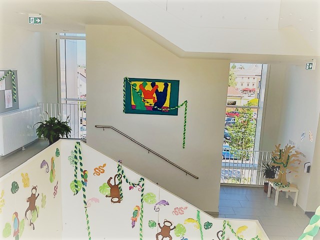 In der Volksschule Mattighofen sah ich mich auch ein bisschen um, es ist ein Neubau mit viel Lichteinwirkung, was die Schule freundlich macht. Was mir besonders aufgefallen ist, es sind in jedem Stockwerk Zeichnungen von Kindern aufgehängt. Auch der Stiegenaufgang ist mit Zeichnungen bestückt. Man hat gleich den Eindruck, hier wird sehr viel Wert auf Kreativität gelegt. Eine Schule mit Vorbild-Wirkung.