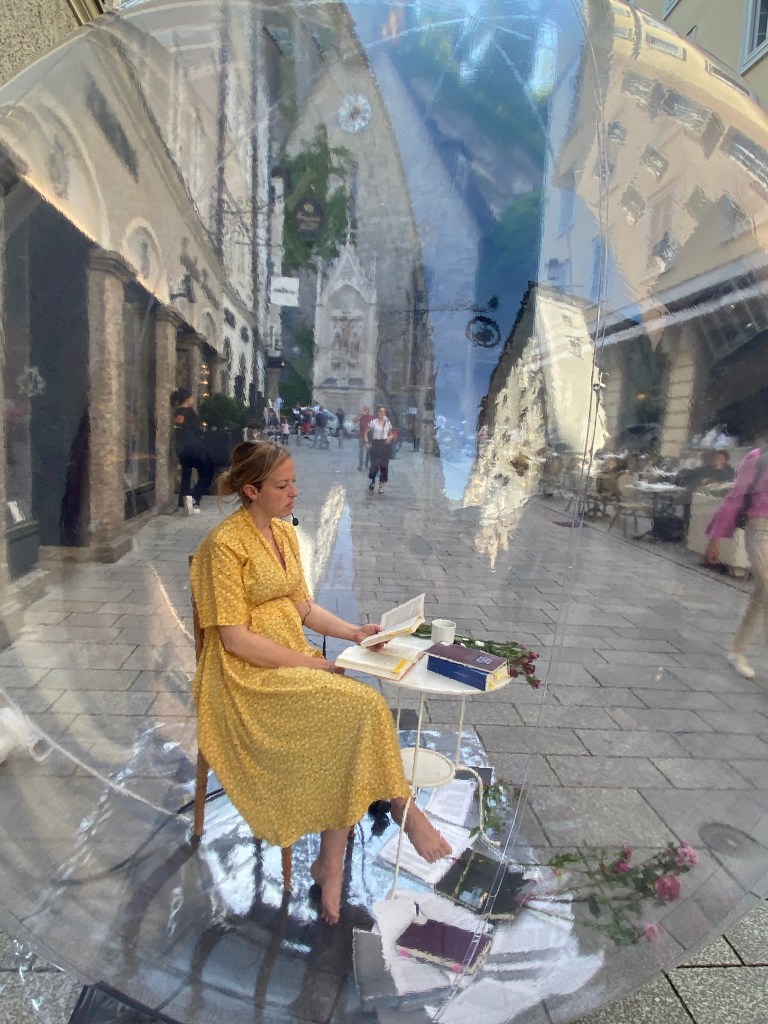 Viele Personen in der Getreidegasse – Touristen wie Einheimische – wussten im ersten Moment nicht was hier geschah. Eine durchsichtige Kugel, in dem ein Schreibtisch und eine Person befand, die aus Büchern von Mayröcker las und die Texte auch für Passanten hörbar machte. Eine stille – oder doch nicht – Installation für Gehende, Stehenbleibende und Zuhörende, wobei Gehende mehr waren als Stehenbleibende und Zuhörende.