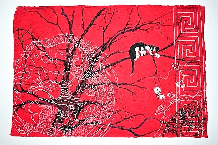 Zum einen die Künstlerin Evi Schartner, die immer wieder interessante Arbeiten liefert. Diesmal mit dem Titel „Catch me if you can“. Diese Arbeiten verleiten einem immer zum Schmunzeln und betrachtet man die Arbeit ganz genau, kommen viele interessante Details zum Vorschein. Bild 2: Ihre Bäume, ein Markenzeichen von ihr und dann baute sie einen Drachen mit ein. Bei Bild 1, kommt der Kater vor, der wiederum sich auf den Tweety Bird stürzen will. Fantastisch, diese Verbindungen und neben den beiden Comic Figuren der Drache. Das kräftige Rot im Hintergrund gibt der Arbeit noch mehr Aussagekraft.