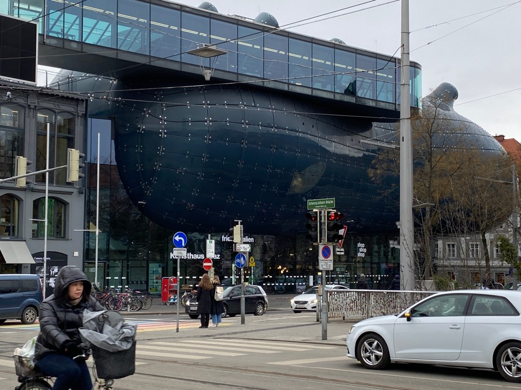 Für die Kulturhauptstadt Graz 2003 bauten die beiden Londoner Architekten Peter Cook und Colin Fournier eine „Luftblase“ deren bläulich schimmernde Hülle über dem gläsernen Erdgeschoss zu schweben scheint.
