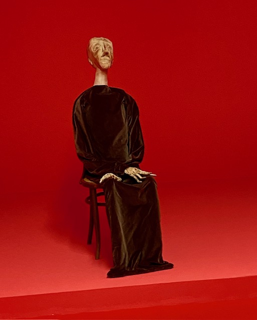 Darüber hinaus ist im Hintergrund eine Figur in einem Samtkleid mit einem Holzstuhl zu sehen. Die Figur deutet in gewisser Weise ein Skelett an. Diese Skulptur stammt von der 2015 verstorbenen Künstlerin Eva Aeppli, die der Nachwelt ein vielschichtiges Werk hinterlassen hat, das in der zweiten Hälfte des 20. Jahrhunderts entstanden ist und Figuren in unterschiedlichen medialen Umsetzungen in den Mittelpunkt stellt. Der seelische Abgrund, der den Einzelnen im Krieg und seinen Folgen erfasste, findet sich bei Aeppli ebenso wie bei den Phantasten.