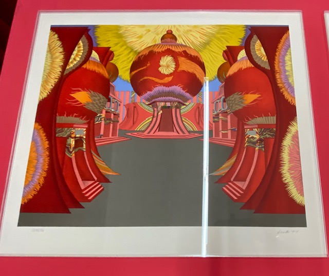 Das Ambiente dieser Ausstellung, die in Rot mit violetten Vorhängen an den Rändern gehalten ist, ist ebenfalls interessant. Es ist als eine Art Bühne gedacht.