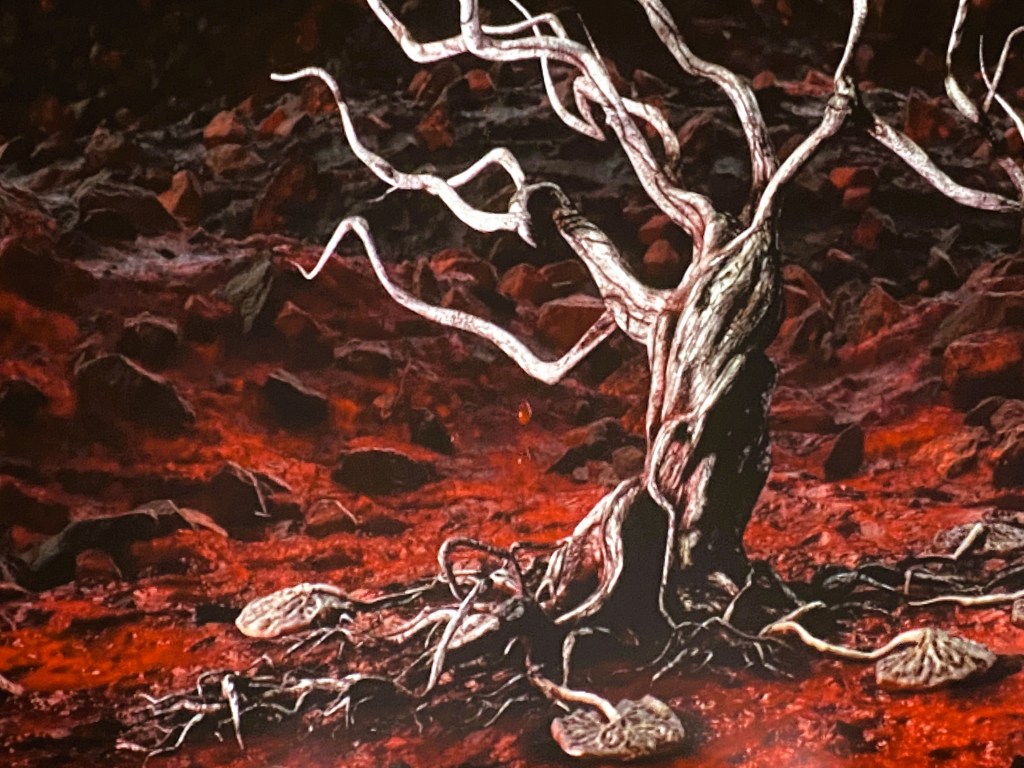 Genau das zeigt das Video in einer Endlosschleife: den weinenden, Tränen vergießenden Baum inmitten einer dunklen, purpurnen, apokalyptischen Landschaft. Das Video zieht einen in seinen Bann, man spürt, wie der Baum blutet, wie sich die welken Blätter vor dem schwarzen Hintergrund noch einmal aufbäumen wollen. Im Hintergrund die zerstörte Landschaft, in blutendes Rot getaucht und von schwarzen Bergen umgeben. Der Baum, der eher einem Skelett gleicht, versucht vergeblich mit seinen Armen oder Zweigen eine Richtung zu geben. Die Musik im Hintergrund ergibt ein stimmiges, geheimnisvolles und trauriges Bild…