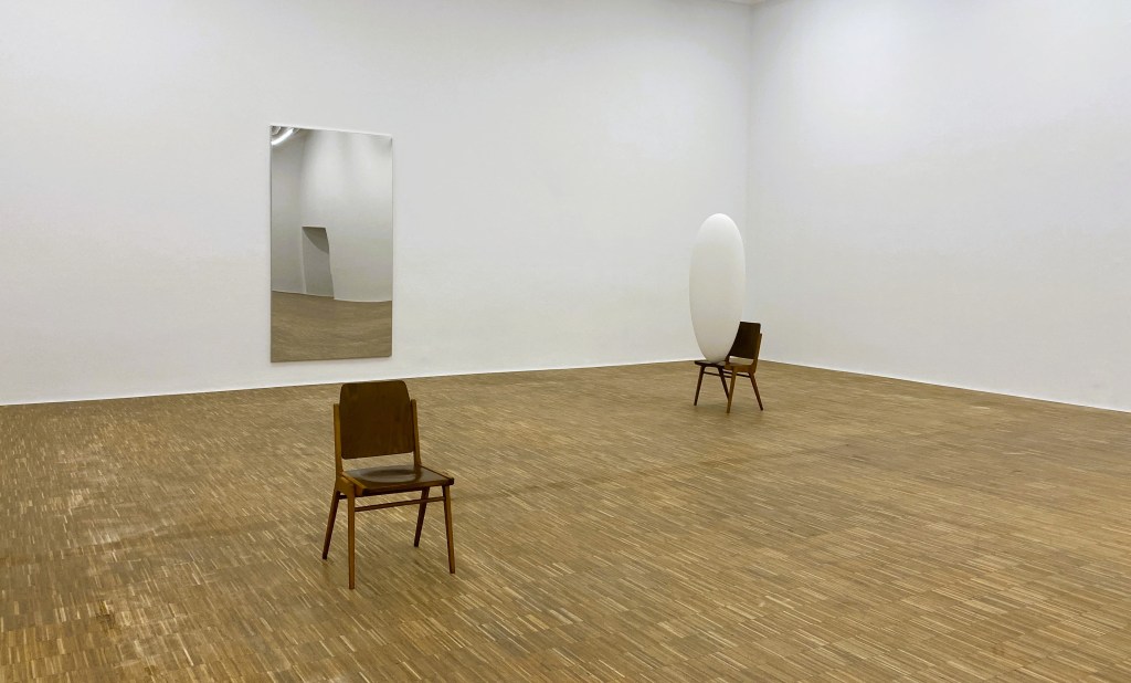 Betritt man die große Halle des Salzburger Kunstvereins, in der die Arbeit von Tarik Kiswanson zu sehen ist, fällt der Blick zunächst auf ein großes, oval geformtes Objekt (es handelt sich um eine Kokonskulptur). Der Blick wandert weiter nach links, wo ein Stuhl steht, auf dessen Sitzfläche sich ebenfalls ein eiförmiges Objekt (eine Kokonskulptur) befindet. Eine riesige Spiegelfläche an der Rückwand lässt den Blick noch einmal aus einer anderen Perspektive durch den Raum schweifen. Dreht man sich um, steht ein weiterer Stuhl im Raum. Dieser ist als Kunstobjekt gestaltet. (Es handelt sich um einen Franz Schuster: Bicolor Stuhl von 1959) und in der Mitte des Raumes steht ein Objekt aus Kunstharz mit einer Flamme im Inneren oder korrekter „Respite, 2020“ Kunstharz, Kerze.