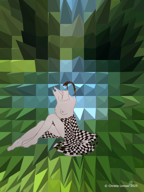 Zarah Leander stellte einst die Frage: Kann denn Liebe Sünde sein? Auch hier stellt sich diese Frage neu – ist die weibliche Form eine Provokation? Ein Sinnbild der Verführung oder einfach Ausdruck von Schönheit und Freiheit? Das Schachbrettmuster und der verzerrte Fluss spielen mit Gegensätzen: Kontrolle und Hingabe, Ordnung und Chaos, Unschuld und Versuchung.