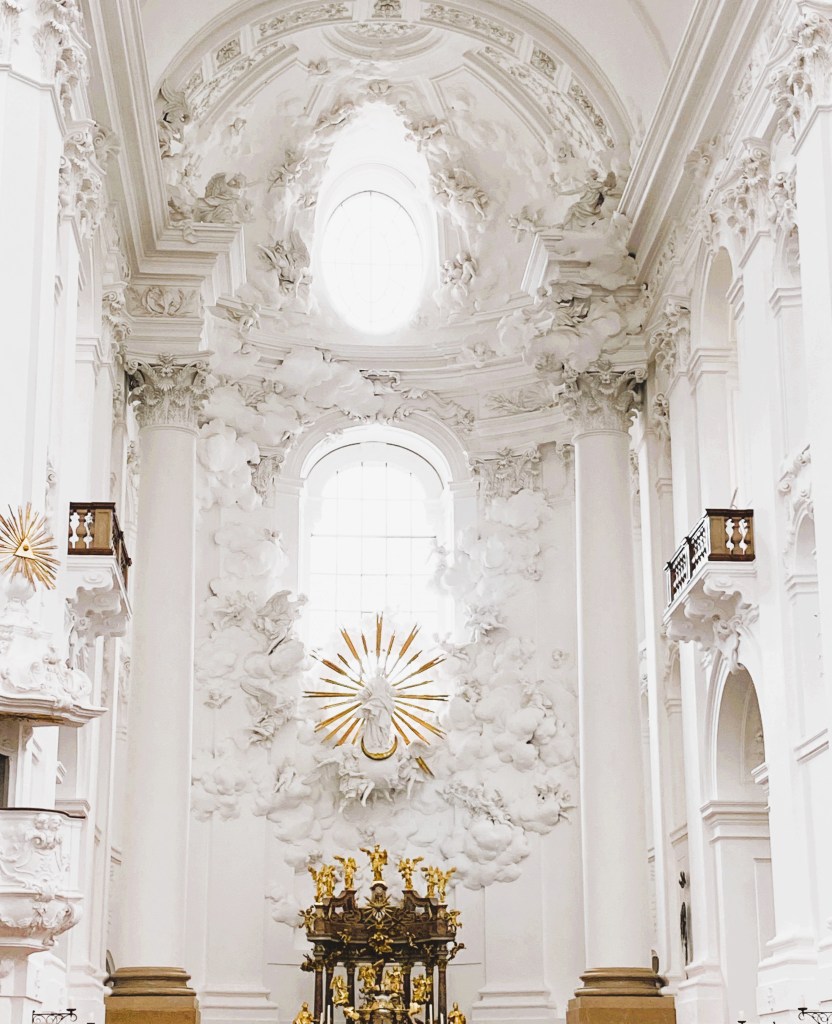 Schon beim Betreten durch das Hauptportal umfängt mich diese Weite, diese stille Größe. Die Kirche, zwischen 1696 und 1707 von Johann Bernhard Fischer von Erlach im Auftrag von Fürsterzbischof Johann Ernst von Thun erbaut, zählt zu den bedeutendsten Barockkirchen Mitteleuropas. Das Tonnengewölbe spannt sich in 29 Metern Höhe über den Raum, die Kuppel hat denselben Radius wie der Grundriss – ein architektonisches Zentrum, das Himmel und Erde verbindet. Zahlreiche Fenster durchbrechen das Mauerwerk und tauchen den Raum zu jeder Tageszeit in kristallenes Licht. Die strahlende Madonna am Hochaltar, umgeben von 71 Engeln, zieht den Blick magisch an – ein Sinnbild göttlicher Weisheit.