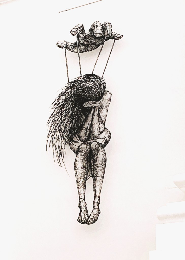 Rechts neben dem Altar entdeckte ich eine Skulptur, die mir bisher nie aufgefallen war. Eine Hand – wie die eines Marionettenspielers – hält eine Frau an Fäden. Ihr Blick ist gesenkt, ihr Körper in sich gekehrt. Trauer? Erschöpfung? Widerstand?