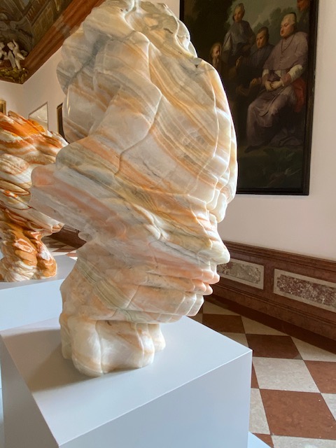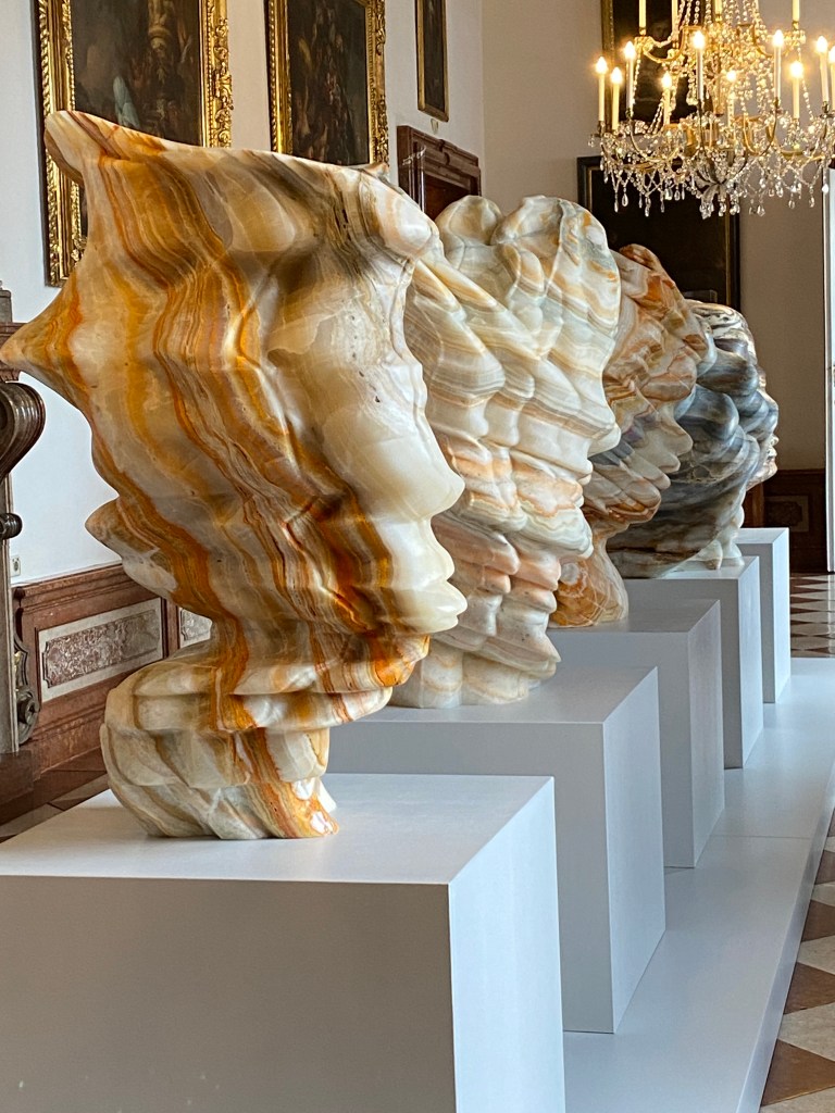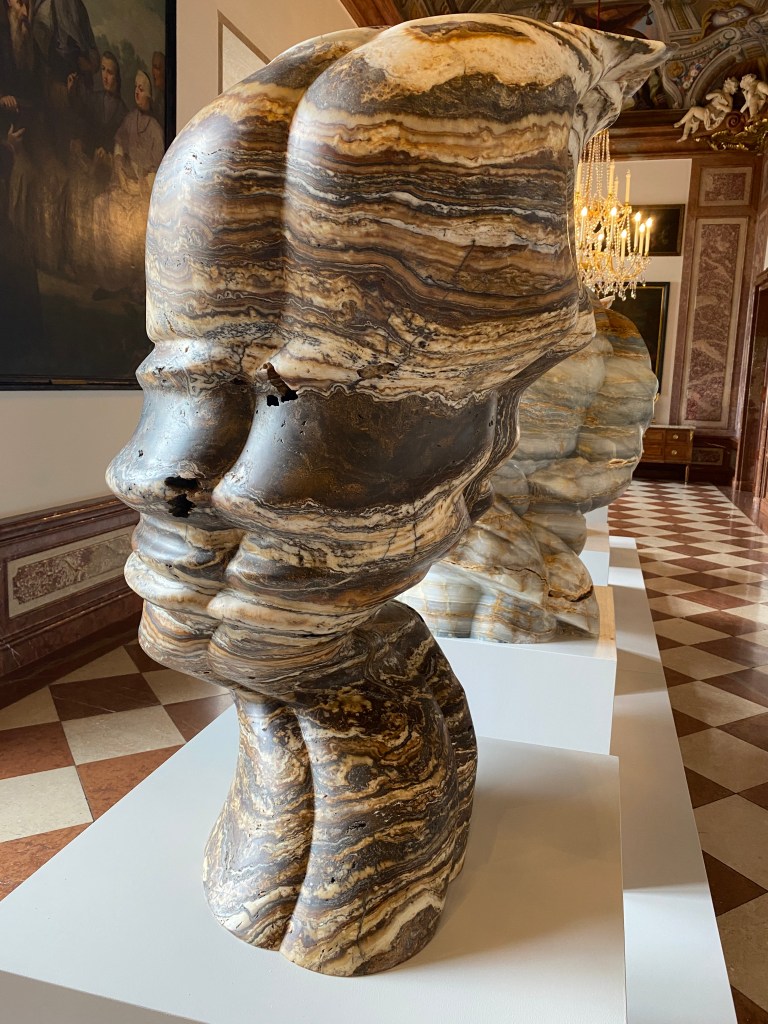Besonders fasziniert haben mich die fünf Köpfe (Untitled, 2019) aus Travertin-Stein. Betrachtet man diese aus Marmor anmutenden Blöcke, erkennt man je nach Blickwinkel einen anderen Ausdruck. Craggs Skulpturen muss man in Ruhe umrunden. Aus einer Position zeigen sie Gesichter und Körper. Aus einer anderen Position wirken sie wiederum wie abstrakte Formen, die an Schwämme oder andere Naturstrukturen erinnern.