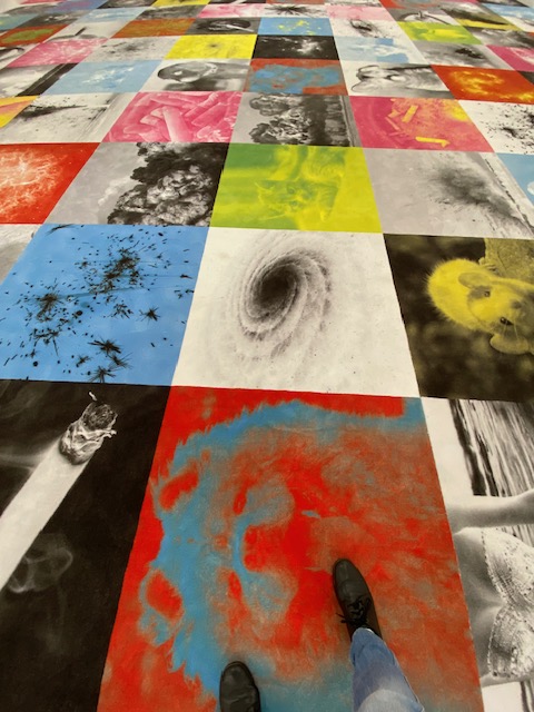 Beim Betreten des Ausstellungsraumes trifft es einen mit voller Wucht. Ein Farbenrausch aus bunten Teppichfliesen lenkt den Blick auf den Boden. Sie ziehen nicht nur durch ihre Farbigkeit, sondern auch durch die darauf abgebildeten Motive an.