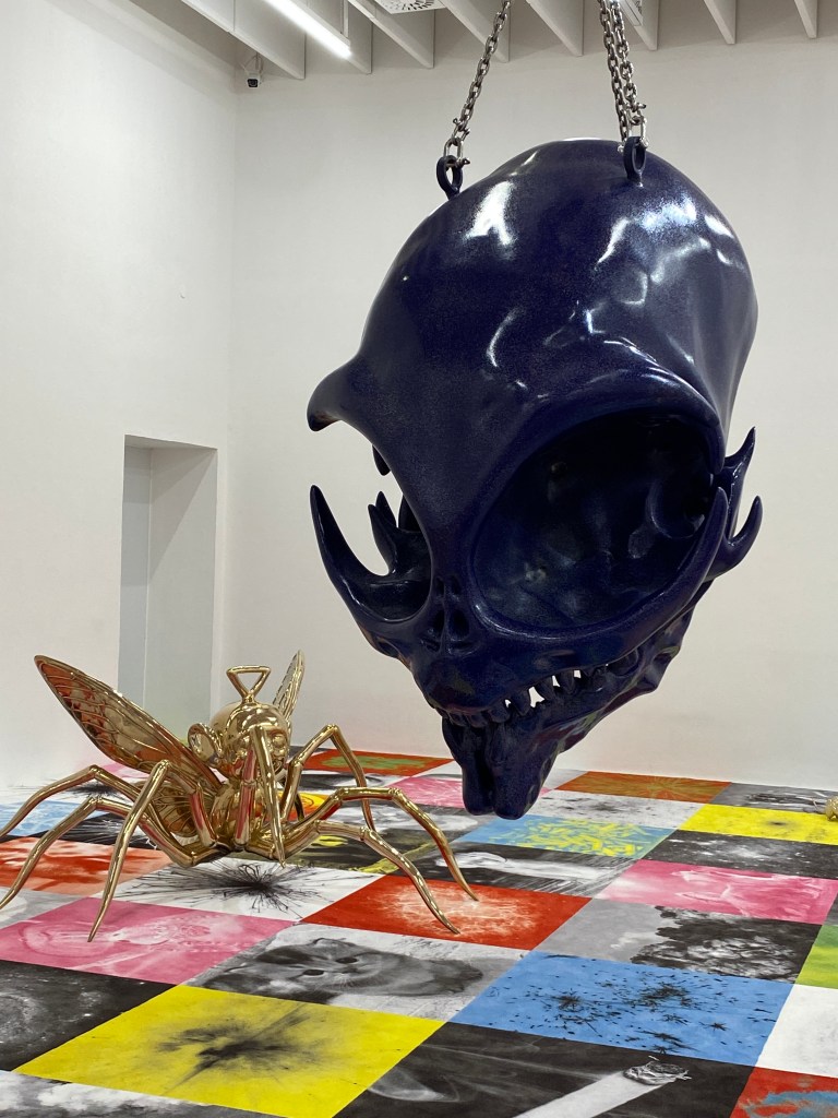 Der Raum wirkt wie ein Befreiungsschlag – offen, grell, fast provokativ. Die spärlich platzierten Skulpturen sprechen eine eigene, eindringliche Sprache. Zwei übergroße, von der Decke pendelnde Skulpturen erinnern an Totenköpfe in Schwarz und Blau. Leben und Tod? Warnung oder Inszenierung?